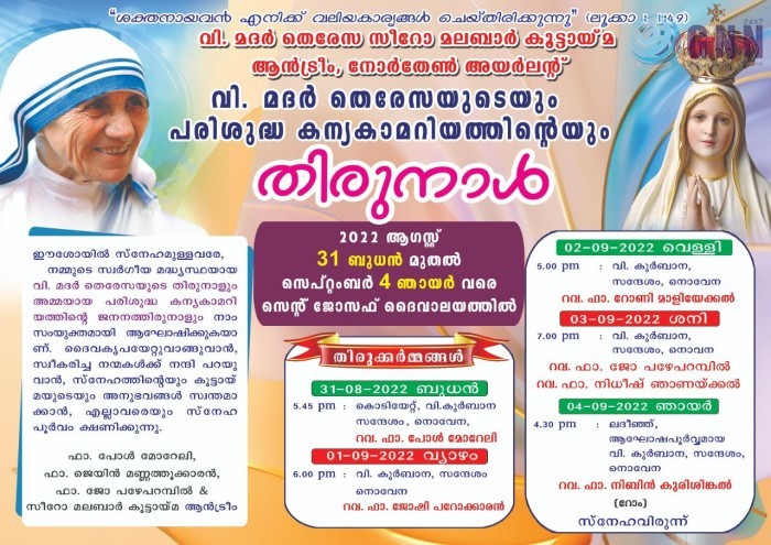 ആൻട്രീം : ആൻട്രീം (നോർത്തേൺ അയർലണ്ട്) സീറോ മലബാർ ദേവാലയത്തിൽ ഇടവക മദ്ധ്യസ്ഥയായ വിശുദ്ധ മദർ തെരേസയുടെ തിരുനാളും പരിശുദ്ധ കന്യകാമറിയത്തിൻ്റെ ജനനതിരുനാളും 2022 ഓഗസ്റ്റ് 31 മുതൽ സെപ്റ്റംബർ 4 വരെ സംയുക്തമായി ആഘോഷിക്കുന്നു. ആൻട്രീം സെൻ്റ്. ജോസഫ് ദേവാലയത്തിൽ സെപ്റ്റംബർ 31 ബുധനാഴ്ച വൈകിട്ട് 5:45 നു വികാരി ഫാ. പോൾ മോറേലി തിരുനാളിനു കൊടിയേറ്റും. തുടർന്ന് വിശുദ്ധ കുർബാനയും നൊവേനയും.