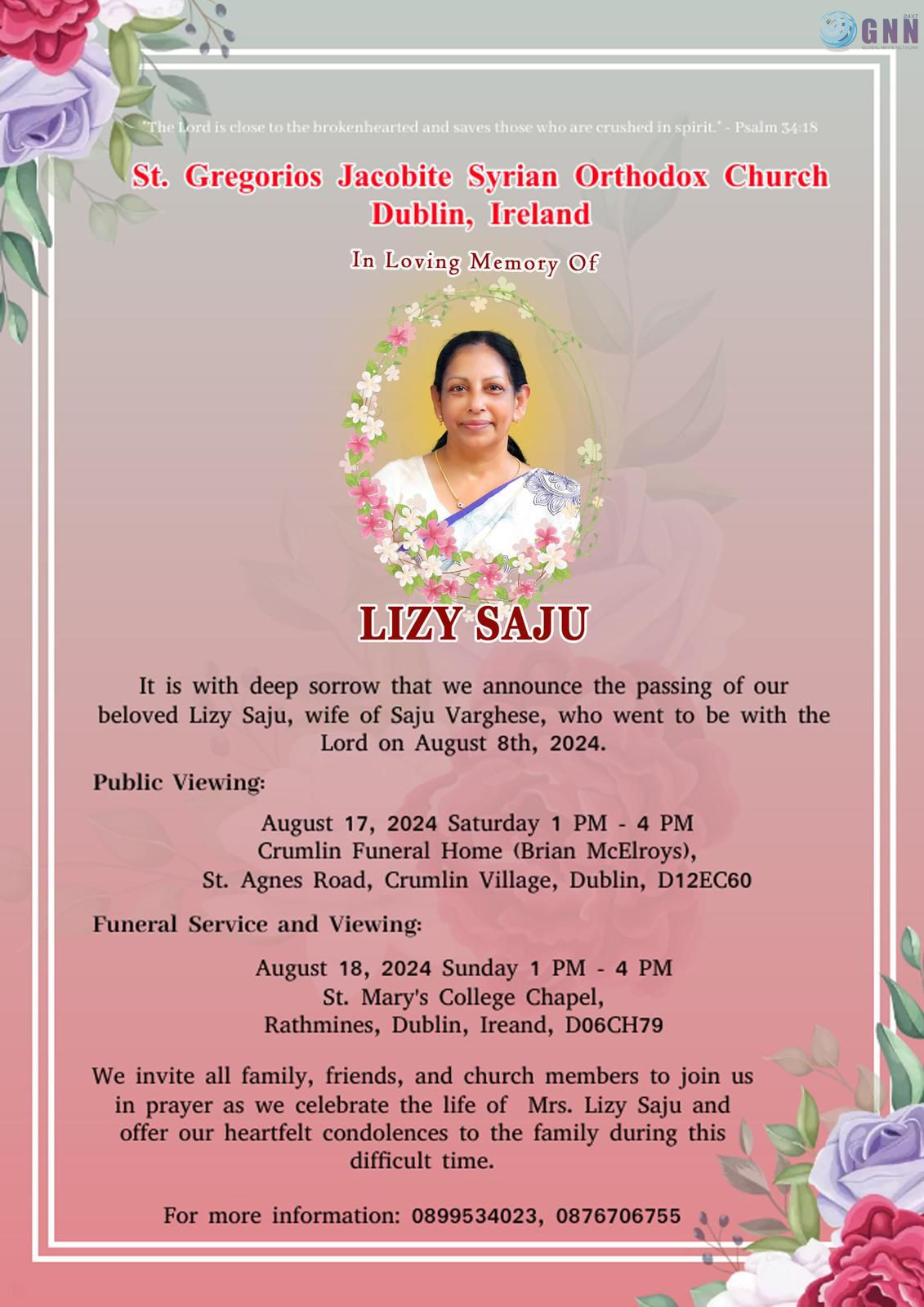 മയോയിൽ വാഹനാപകടത്തിൽ മരണപ്പെട്ട ലിസി സാജുവിന്റെ സംസ്കാരം ഓഗസ്റ്റ് 18, ഞായറാഴ്ച നടക്കും. St. Mary’s College Chapel, Rathmines, ഡബ്ലിനിൽ ഉച്ചയ്ക്ക് ഒരു മണിക്ക് സംസ്കാര ചടങ്ങുകൾ ആരംഭിക്കും. ഓഗസ്റ്റ് 17, ശനിയാഴ്ച ഉച്ചയ്ക്ക് 1 മണി മുതൽ 4 മണി വരെ Crumlin Funeral Home (Brian McElroys), St. Agnes Road, Crumlin Village, ഡബ്ലിനിൽ പൊതുദർശനവുമുണ്ടാകും.
