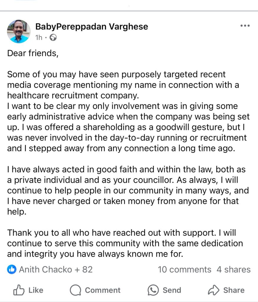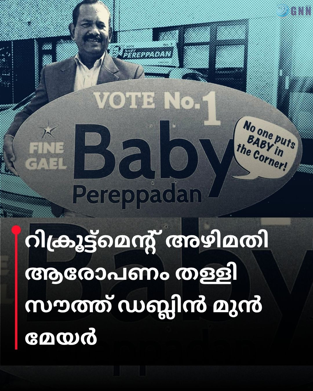 തനിക്കെതിരെയുള്ള റിക്രൂട്ട്മെന്റ് അഴിമതി ആരോപണങ്ങൾ അടിസ്ഥാന രഹിതമാണെന്ന് സൗത്ത് ഡബ്ലിൻ മുൻ മേയറും താലയിലെ ഫിനഗേൽ കൗൺസിലറുമായ ബേബി പെരേപ്പാടൻ.ബേബി പെരേപ്പാടൻ പങ്കാളിയായ റിക്രൂട്ട്മെൻ്റ് കമ്പനി,ഐറിഷ് നഴ്‌സിംഗ് ഹോമുകളിൽ റിക്രൂട്ട്മെന്റിനായി ഇന്ത്യക്കാർ ഉൾപ്പെടെയുള്ള വിദേശ നഴ്‌സുമാരിൽ നിന്ന്ആയിരക്കണക്കിന് യൂറോ “ഏജൻസി ഫീസായി” ഈടാക്കി എന്ന് The Journal റിപ്പോർട്ട് ചെയ്തിരുന്നു.