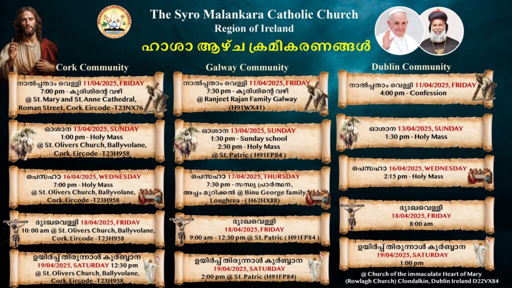 അയർലണ്ടിലെ ഡബ്ലിൻ, കോർക്ക്, ഗാൽവേ സെന്ററുകളിൽ ഹാശാ ആഴ്ചയുടെ ശുശ്രുഷകൾ ഭക്തിപൂർവം നടത്തപെടുന്നു. വിവിധ സെന്ററുകളിലെ ശുശ്രുഷകളുടെ സമയക്രമങ്ങൾ ചേർക്കുന്നു. വിശ്വാസസമൂഹത്തിൽ പെട്ട ഏവരെയും ശുശ്രുഷകളിലേക്ക് സ്നേഹപൂർവ്വം സ്വാഗതം ചെയ്യുന്നതായി അയർലണ്ടിലെ മലങ്കര സുറിയാനി കത്തോലിക്ക സഭ കൂട്ടായ്മകൾ അറിയിച്ചു.