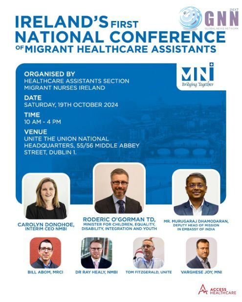 അയർലണ്ടിലെ പ്രവാസി ഹെൽത്ത് കെയർ അസിസ്റ്റന്റുമാരുടെ പ്രഥമ ദേശീയ സമ്മേളനം ഒക്ടോബര് 19 ശനിയാഴ്ച ഡബ്ലിനിൽ യുണൈറ്റ് യൂണിയന്റെ ഹെഡ്ക്വാർട്ടേഴ്സിൽ വച്ച് നടത്തപ്പെടും. മൈഗ്രന്റ് നഴ്സസ് അയർലണ്ടിന്റെ ഹെൽത്ത് കെയർ അസിസ്റ്റന്റുമാരുടെ വിഭാഗം സംഘടിപ്പിക്കുന്ന സമ്മേളനത്തിൽ ആരോഗ്യമേഖലയിലെ വിശിഷ്ടാതിഥികൾക്കൊപ്പം, ഇക്വാലിറ്റി, ഇന്റഗ്രേഷൻ, ഡിസബിലിറ്റി, ചിൽഡ്രൻ വകുപ്പ് മന്ത്രിയായ റോഡറിക് ഓഗോർമാൻ മുഖ്യാതിഥിയാകും.