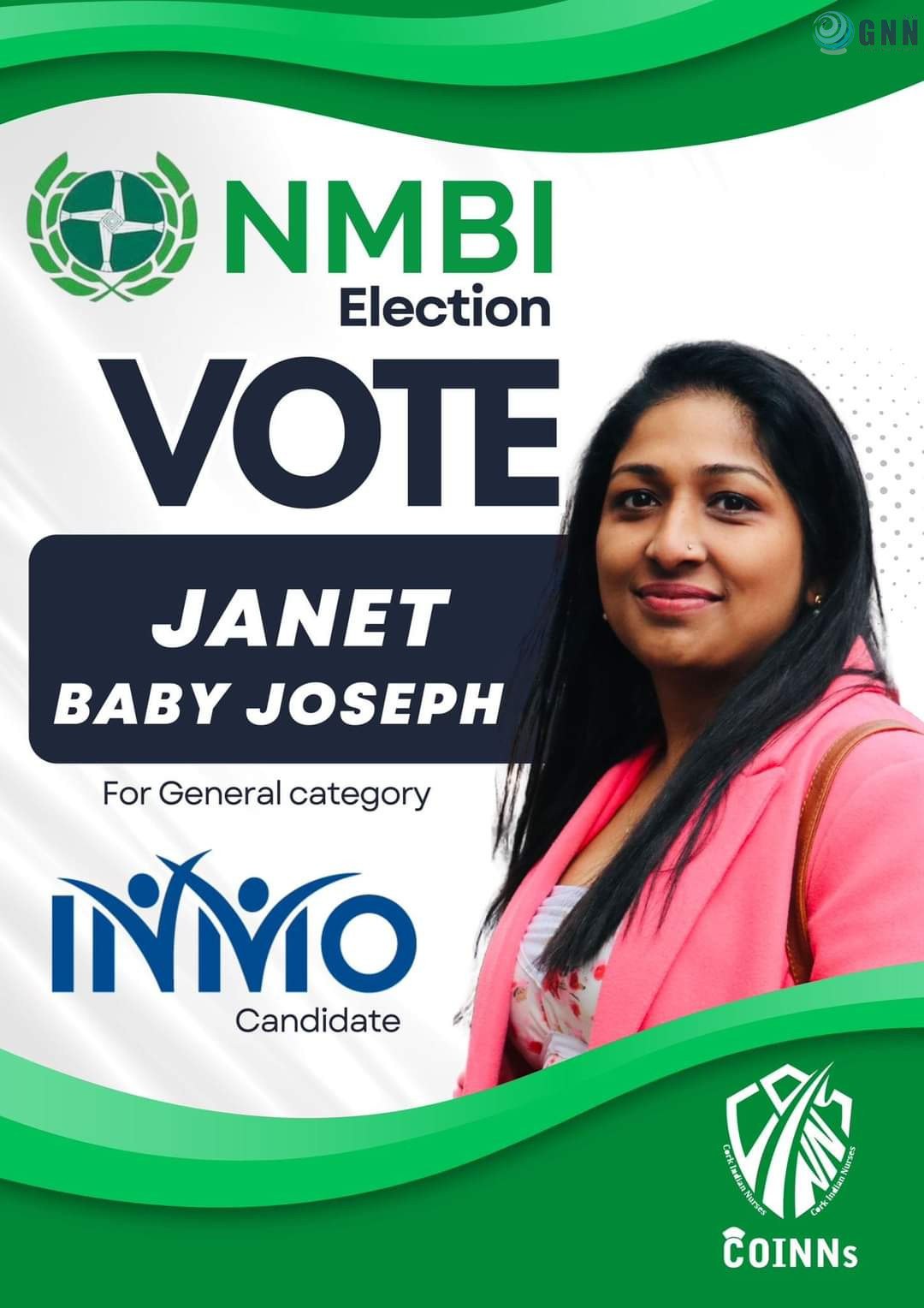 എൻ എം ബി ഐ (Nursing and Midwifery Board of Ireland) ബോർഡ് ഇലക്ഷനിൽ സമ്പൂർണ വിജയ പ്രതീക്ഷയിലാണ് ജാനറ്റ് ബേബി ജോസഫ്. ഐഎൻഎംഒയുടെ കോർക്ക് എച്ച്എസ്ഇ ബ്രാഞ്ചിൻ്റെ വൈസ് സെക്രട്ടറിയും കോർക്ക് ഇന്ത്യൻ നഴ്സസ് അസോസിയേഷൻ പ്രസിഡൻ്റുമാണ് ജാനറ്റ് ബേബി ജോസഫ്.