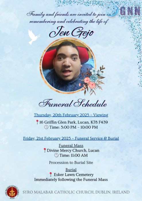 ലൂക്കൻ: ഡബ്ലിൻ ലൂക്കനിൽ താമസിക്കുന്ന കോട്ടയം ഒളശ്ശ സ്വദേശി ജിജോ ജോർജ്ജ്, സ്മിത ദമ്പതികളുടെ മകൻ ജെൻ ജിജോ (17) നിര്യാതനായി. ജെലിൻ, ജോവാനാ എന്നിവർ സഹോദരങ്ങളാണ്. ഒളശ്ശ സെൻ്റ് ആന്റണിസ് ഇടവക പൂങ്കശേരി കുടുംബാഗമാണ്. ഫെബ്രുവരി 20 വ്യാഴാഴ്ച വൈകിട്ട് 5 മുതൽ 10 വരെ ലൂക്കൻ ഗ്രിഫ്ഫിൻ ഗ്ലെൻ പാർക്കിലെ 16 നമ്പർ വസതിയിൽ പൊതുദർശനത്തിനു വയ്ക്കുന്ന മൃതദേഹം വെള്ളിയാഴ്ച രാവിലെ 11 മണിക്ക് ലൂക്കൻ ഡിവൈൻ മേഴ്സി ദേവാലയത്തിലെ ശുശ്രൂഷകൾക്ക് ശേഷം സംസ്കരിക്കും. എസ്കർ ലൊൺ സെമിത്തേരിയിലാണ്സംസ്കരിക്കുക.