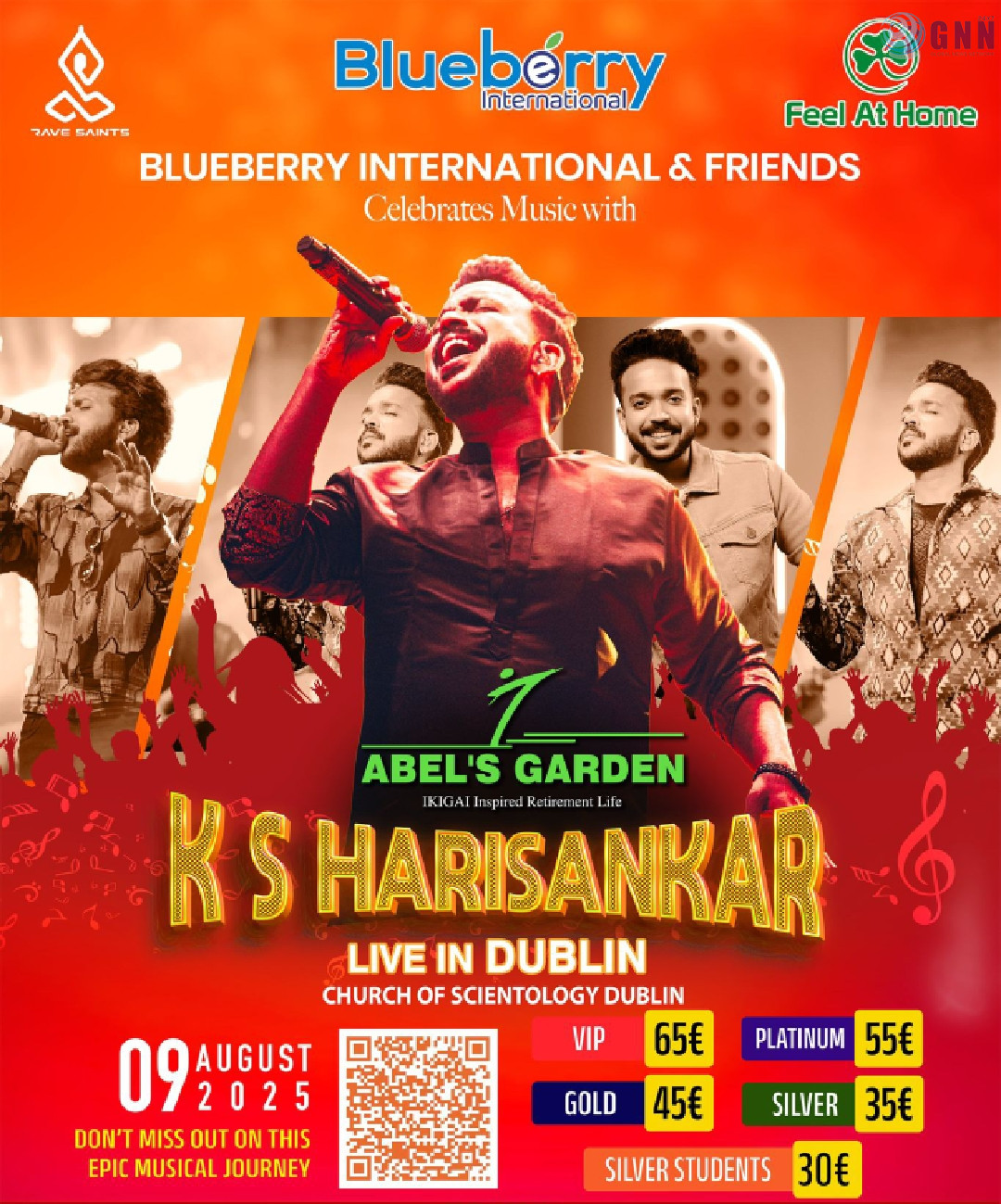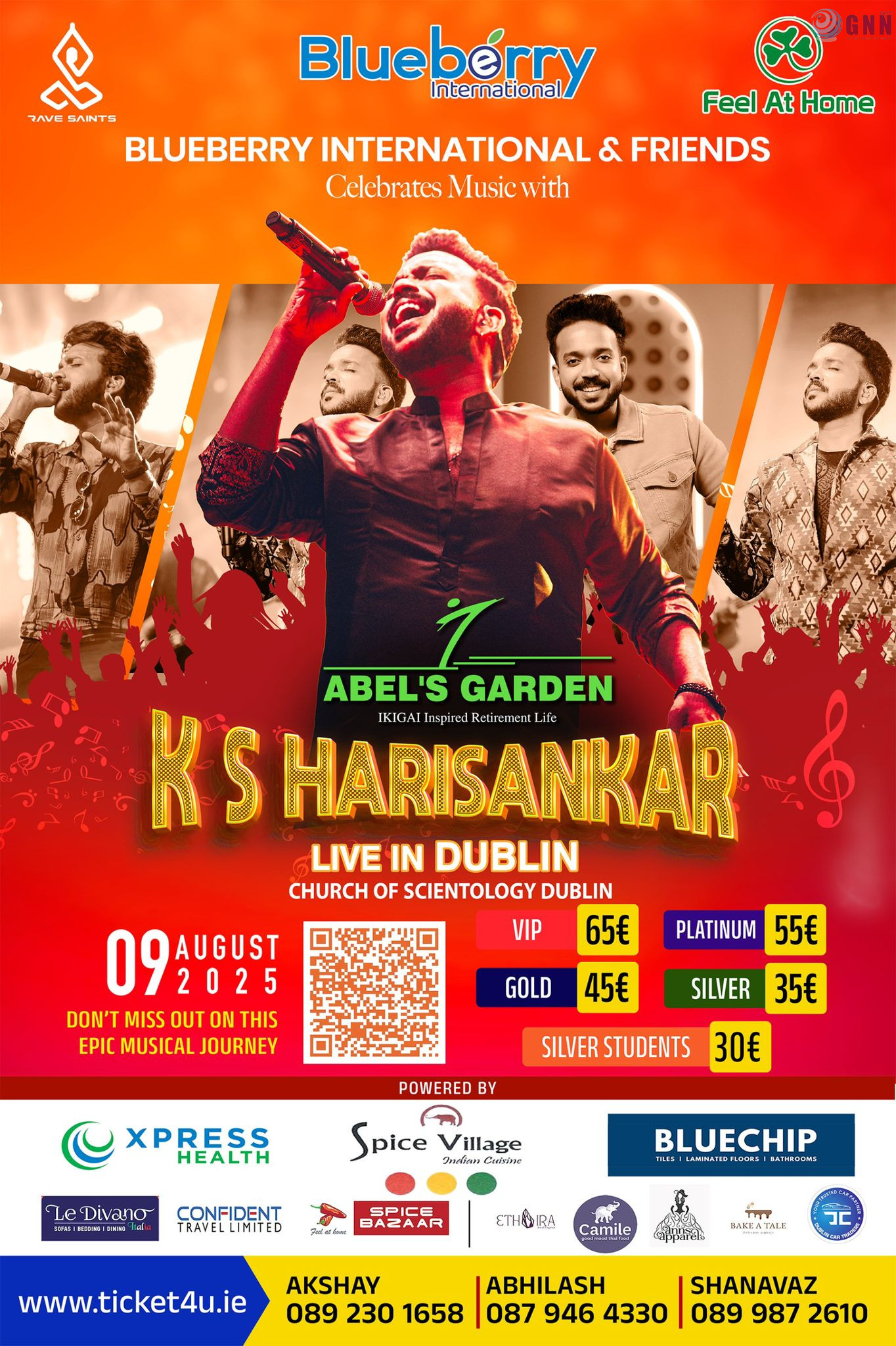 മലയാളിളുടെ പ്രിയ യുവ ഗായകൻ, മാസ്മരിക ആലാപന ശൈലി കൊണ്ട് ആസ്വാദക ഹൃദയങ്ങൾ കവർന്ന കെ എസ് ഹരിശങ്കർ അയർലണ്ടിൽ എത്തുന്നു. BLUEBERRY INTERNATIONAL സംഘടിപ്പിക്കുന്ന KS HARISANKARLIVE IN DUBLIN ഓഗസ്റ്റ് 9 ന് ഡബ്ലിൻ സയന്റോൾജി സെന്ററിൽ അരങ്ങേറും. ABEL’S GARDEN, RAVE SAINTS, Feel At Home, എന്നിവരും പരിപാടിയുടെ പങ്കാളികളാണ്. ടിക്കറ്റ് വില്പന പുരോഗമിക്കുന്നു. നിങ്ങളുടെ ടിക്കറ്റുകൾ ഇപ്പോൾ തന്നെ ബുക്ക്‌ ചെയ്യാം.