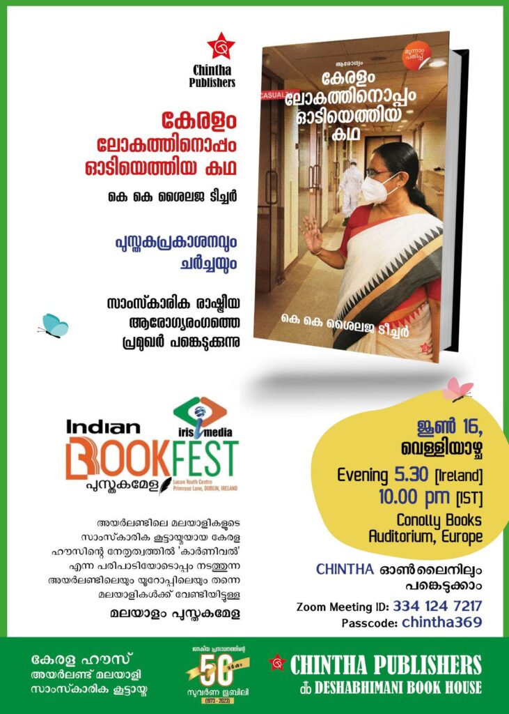 മുൻ ആരോഗ്യമന്ത്രി കെ. കെ. ശൈലജ ടീച്ചർ എഴുതിയ കേരളം ലോകത്തിനൊപ്പം ഓടിയെത്തിയ കഥ എന്ന പുസ്തകത്തിന്റെ പ്രകാശനവും ചർച്ചയും സംഘടിപ്പിച്ചിട്ടുണ്ട്. രാഷ്ട്രീയ സാംസ്കാരിക മേഖലകളിലെ പ്രമുഖർ പങ്കെടുക്കും. ‘ചിന്ത’ ഓൺലൈൻ വഴിയും നിങ്ങൾക്കും പങ്കെടുക്കാം.