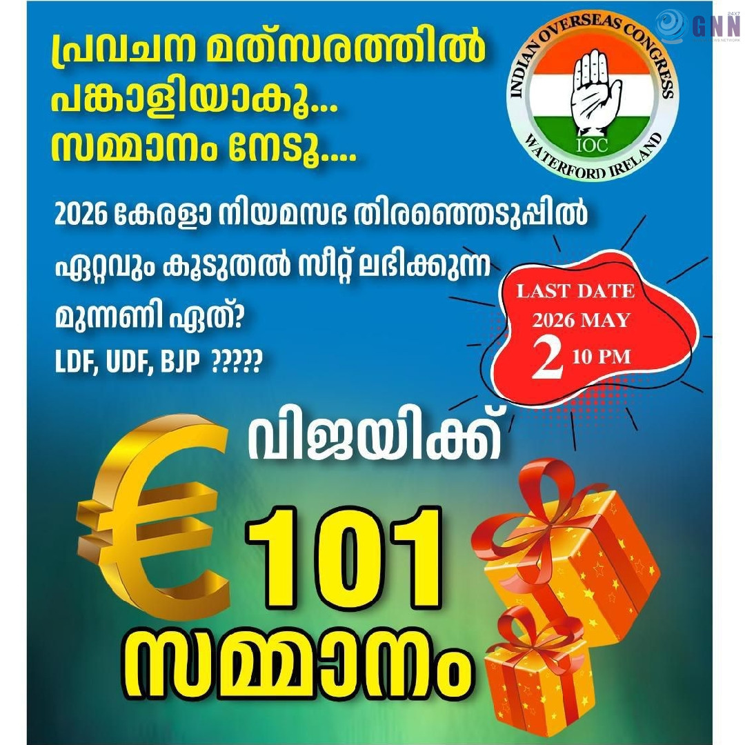 കേരള നിയമസഭാ തെരഞ്ഞെടുപ്പ് ഫലം മെയ് 4ന് പ്രഖ്യാപിക്കുമ്പോൾ, ഏറെ ആവേശം നിറഞ്ഞ ചർച്ചകളാണ് ചൂടുപിടിക്കുന്നത്. നിയമസഭ തിരഞ്ഞെടുപ്പിൽ ഏറ്റവും കൂടുതൽ സീറ്റ് ലഭിക്കുന്ന മുന്നണി ഏതാകും? നിങ്ങളുടെ അഭിപ്രായം പറയാം, സാമാനം നേടാം. ഇന്ത്യൻ ഓവർസീസ് കോൺഗ്രസ് വാട്ടർഫോർഡ് നടത്തുന്ന പ്രവചന മത്സരത്തിൽ പങ്കെടുത്ത് 101 യൂറോ സമ്മാനം നിങ്ങൾക്ക് സ്വന്തമാക്കാം.