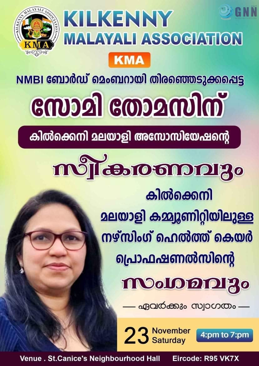 NMBI ബോർഡ് മെംബറായി തിരഞ്ഞെടുക്കപ്പെട്ട സോമി തോമസിന് കിൽക്കെനി മലയാളി അസോസിയേഷന്റെ ആjദരം. സോമി തോമസിന് KMA ഒരുക്കുന്ന സ്വീകരണവും കിൽക്കെനി മലയാളി കമ്മ്യൂണിറ്റിയിലുള്ള നഴ്സിംഗ് ഹെൽത്ത് കെയർ പ്രൊഫഷണൽസിന്റെ സംഗമവും നവംബർ 23, ശനിയാഴ്ച നടക്കും. St.Canice’s Neighbourhood Hall ൽ നടക്കുന്ന സംഗമത്തിലേക്ക് ഏവരെയും സ്വാഗതം ചെയ്യുന്നു.
