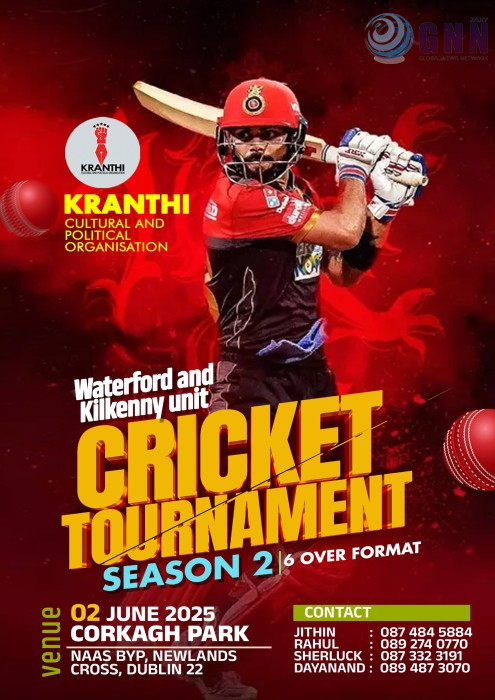ഡബ്ലിൻ: അയർലണ്ടിലെ ക്രിക്കറ്റ് പ്രേമികൾക്ക് ആവേശം പകരാൻ ക്രാന്തിയുടെ വാട്ടർഫോർഡ്, കിൽക്കെനി യൂണിറ്റുകൾ സംയുക്തമായി ഒരു ക്രിക്കറ്റ് ടൂർണമെന്റ് സംഘടിപ്പിക്കുന്നു. ജൂൺ 2-ന് ഡബ്ലിനിലെ കോർക്കാഗ് പാർക്കിൽ വെച്ചാണ് ഈ ടൂർണമെന്റ് അരങ്ങേറുന്നത്.