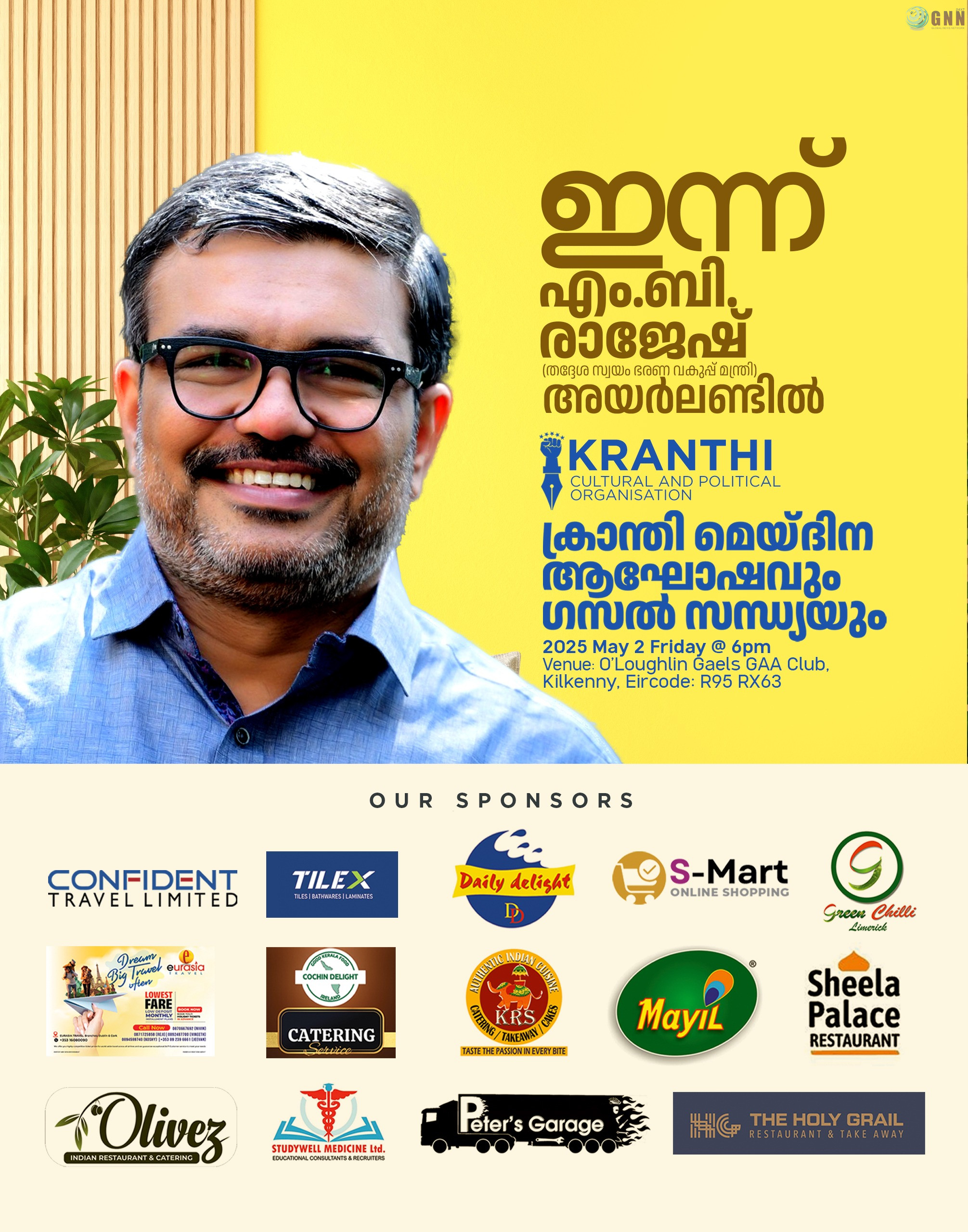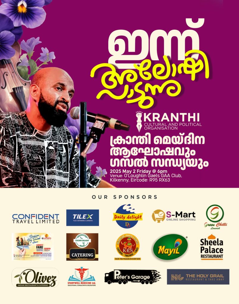 കിൽക്കെനി: അയർലണ്ടിലെ ഇടതുപക്ഷ സാംസ്കാരിക സംഘടനയായക്രാന്തിയുടെ മെയ്ദിനാഘോഷം ഇന്ന് വിപുലമായ പരിപാടികളോടെ കിൽക്കെനിയിൽ വച്ച് സംഘടിപ്പിക്കുന്നു. കേരള സംസ്ഥാന തദ്ദേശ സ്വയംഭരണ, എക്സൈസ്, പാർലമെൻററി കാര്യവകുപ്പ് മന്ത്രി എം. ബി രാജേഷ് മെയ്ദിന പരിപാടി ഉദ്ഘാടനം ചെയ്യും. കില്ക്കെനിയിലെ O’Loughlin Gael GAA ക്ലബ്ബിൽ (Eircode R95 RX63) വൈകിട്ട് ആറുമണിക്ക് പരിപാടികൾ ആരംഭിക്കും.