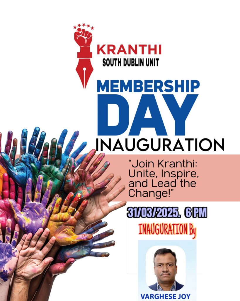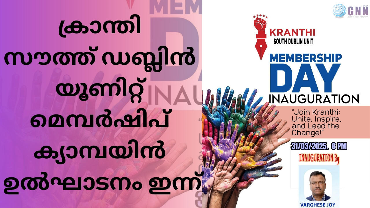 അയർലണ്ടിലെ ഇടതുപക്ഷ സാംസ്കാരിക സംഘടനയായ ക്രാന്തിയുടെ സൗത്ത് ഡബ്ലിൻ യൂണിറ്റിന്റെ നേതൃത്വത്തിൽ 2025-26 വർഷത്തേക്കുള്ള മെമ്പർഷിപ്പ് ക്യാമ്പയിൻ ഉത്ഘാടനം ഇന്ന് നടക്കും. ഉത്ഘാടനം വൈകിട്ട് 6 മണിക്ക് ക്രാന്തി കേന്ദ്ര കമ്മിറ്റി അംഗവും ആയ ശ്രീ വർഗീസ് ജോയ് നിർവഹിക്കും രണ്ടുമാസത്തോളം നീണ്ടുനിൽക്കുന്ന അംഗത്വ വിതരണ ക്യാമ്പയിൻ ക്രാന്തിയുടെ മിക്ക യൂണിറ്റുകളിലും നടന്നു വരികയാണ് . കഴിഞ്ഞ എട്ടു വർഷക്കാലമായി ക്രാന്തി നടത്തിയിട്ടുള്ള നിരവധിയായ സാമൂഹിക, സാംസ്കാരിക, ജീവകാരുണ്യ പ്രവർത്തനങ്ങളെ ചൂണ്ടിക്കാണിച്ചുകൊണ്ടാണ് പുതിയ അംഗങ്ങളെ ചേർക്കുന്നത്.