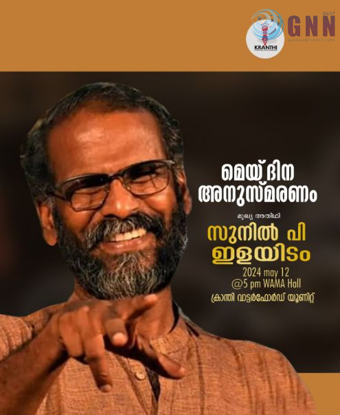 വാട്ടർഫോർഡ്: ക്രാന്തി വാട്ടർഫോർഡ് യൂണിറ്റ് സംഘടിപ്പിക്കുന്ന മെയ്ദിന അനുസ്മരണ പരിപാടി ഇന്ന് വാട്ടർഫോർഡിലെ WAMA (Waterford Academy of Music and Arts)യിൽ വച്ച് സംഘടിപ്പിക്കുന്നു. എഴുത്തുകാരനും പ്രഭാഷകനുമായ ഡോ. സുനിൽ. പി. ഇളയടം മുഖ്യാതിഥിയായി പങ്കെടുക്കുന്നതാണ്. വൈകിട്ട് 5 മണിക്ക് ആരംഭിക്കുന്ന പരിപാടി 8 മണിക്ക് ലഘുഭക്ഷണത്തോടുകൂടി അവസാനിക്കുന്നതാണ്.