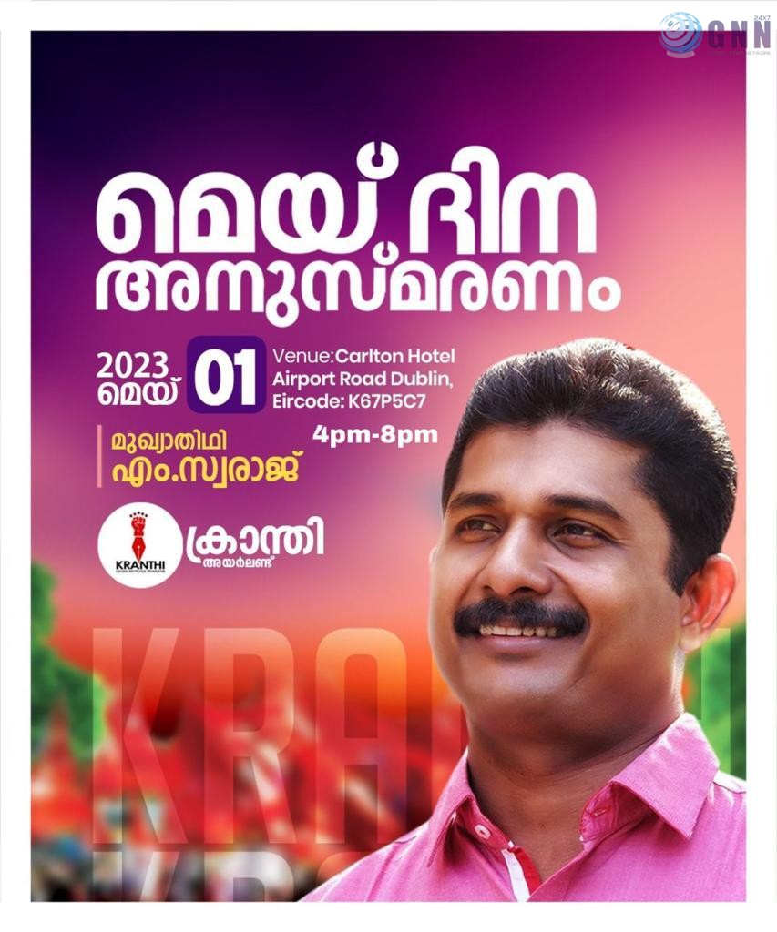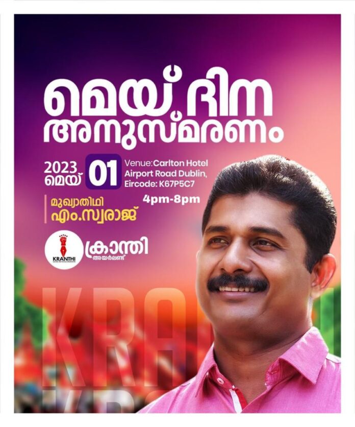 ക്രാന്തിയുടെ മെയ്ദിനാഘോഷവും മാഗസിൻ പ്രകാശനവും ഡബ്ലിനിൽ; മുഖ്യാതിഥി എം. സ്വരാജ്