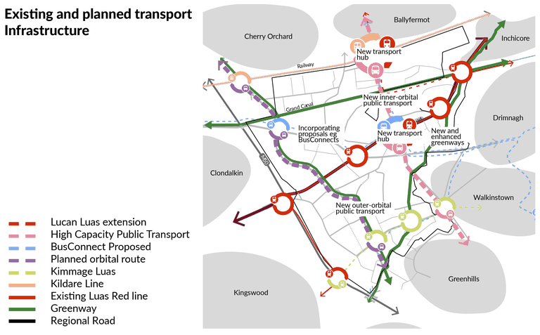 2070-ഓടെ 85,000 ജനസംഖ്യ പ്രതീക്ഷിക്കുന്ന ഇവിടെ കാൽനട,സൈക്കിൾ യാത്ര, പൊതുഗതാഗതം എന്നിവയാകും ഉപയോഗിക്കുക. അപ്പാർട്ട്മെന്റ് ബ്ലോക്കുകൾ, ഭൂഗർഭ കാർ പാർക്കുകൾ ഉപയോഗിച്ച് നിർമ്മിക്കില്ല. ഇത് നിർമ്മാണച്ചെലവ് കുറയ്ക്കുമെന്നും അധികൃതർ പറഞ്ഞു.Naas Road, Kylemore, Cherry Orchard, Red Cow, Greenhills, എന്നീ അഞ്ച് ജില്ലകളെ ഉൾക്കൊള്ളുന്ന പദ്ധതിക്ക് പുതിയ പൊതുഗതാഗതത്തിൽ കാര്യമായ നിക്ഷേപം ആവശ്യമാണ്.