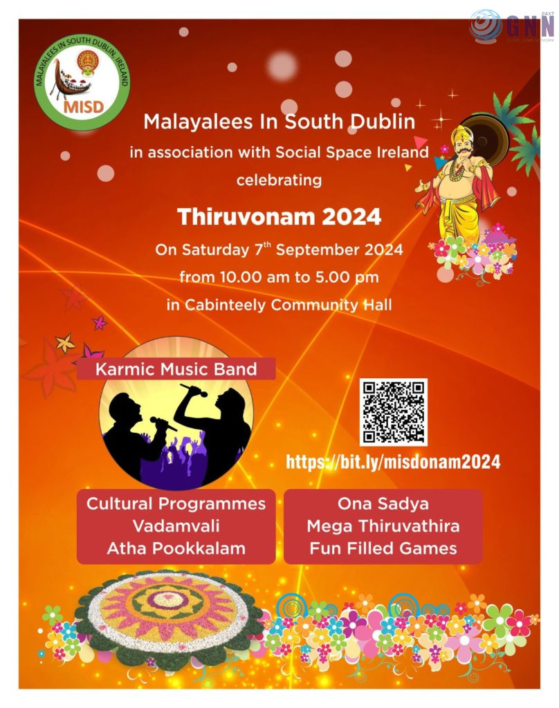 ഓണത്തിനെ വരവേൽക്കാൻ നാടും നഗരവും ഒരുങ്ങുകയാണ്. ഐറിഷ് മലയാളികളുടെ ഓണാവേശത്തിനും ഇക്കുറി പാകിട്ടേറും. Malayalees In South Dublin, Social Space Ireland എന്നിവരുടെ സംയുക്താഭിമുഖ്യത്തിൽ സംഘടിപ്പിക്കുന്ന ആഘോഷ പരിപാടി ‘തിരുവോണം 2024’, സെപ്റ്റംബർ 7 ശനിയാഴ്ച നടക്കും.