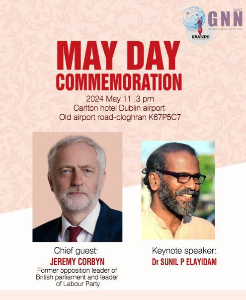 ഞായറാഴ്ച വാട്ടർഫോർഡിൽ വാട്ടർഫോർഡ് യൂണിറ്റിന്റെ ആഭിമുഖ്യത്തിൽ സംഘടിപ്പിക്കുന്ന മെയ്ദിന അനുസ്മരണ പരിപാടിയിലും സുനിൽ പി. ഇളയിടം പങ്കെടുക്കുന്നതാണ്. വാമയിൽ (Waterford Academy of Music and arts, X91W1XF) വെച്ച് വൈകുന്നേരം നാലുമണിക്ക് ആരംഭിക്കുന്ന പരിപാടി 7.30ന് ലഘു ഭക്ഷണത്തോടുകൂടി അവസാനിക്കുന്നതാണ്.