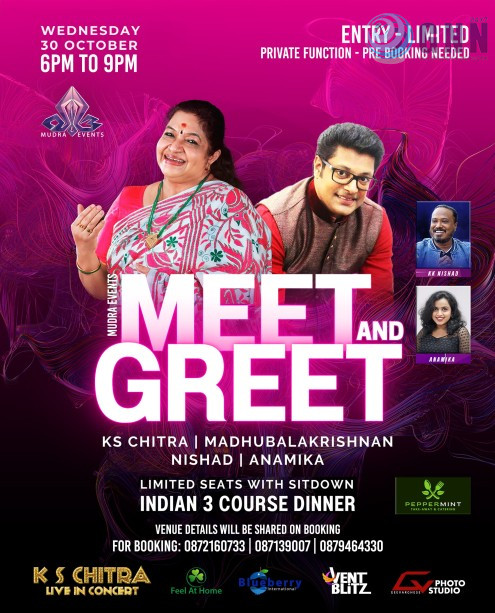 മലയാളികളുടെ പ്രിയ വാനമ്പാടി കെ. എസ്. ചിത്രയുടെ മധുര സംഗീതം ആസ്വദിക്കാൻ ഐറിഷ് സംഗീതപ്രേമികൾക്ക് ഇതാ ഒരിക്കൽ കൂടി സുവർണ്ണാവസരം ഒരുങ്ങുന്നു. MUDRA EVENTS ഒരുക്കുന്ന “MEET AND GREET” ഒക്ടോബർ 30 ബുധനാഴ്ച നടക്കുന്നു. ചിത്രയോടൊപ്പം ഗായകരായ മധു ബാലകൃഷ്ണൻ, നിഷാദ്, അനാമിക എന്നിവരും നിങ്ങൾക്കരികിലേക്ക് എത്തുകയാണ്.