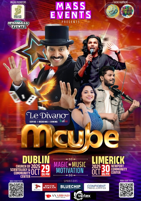 Le Divano -യും മാസ്സ് ഇവന്റസും ചേർന്നവതരിപ്പിക്കുന്ന പ്രശസ്ത മജീഷ്യൻ ഗോപിനാഥ് മുതുകാടിൻറെ നേതൃത്വത്തിൽ മെഗാ സംഗീത മാജിക്ക് ഷോ – ‘Mcube’ ഡബ്ലിനിലും ലീമെറിക്കിലും അരങ്ങേറും.