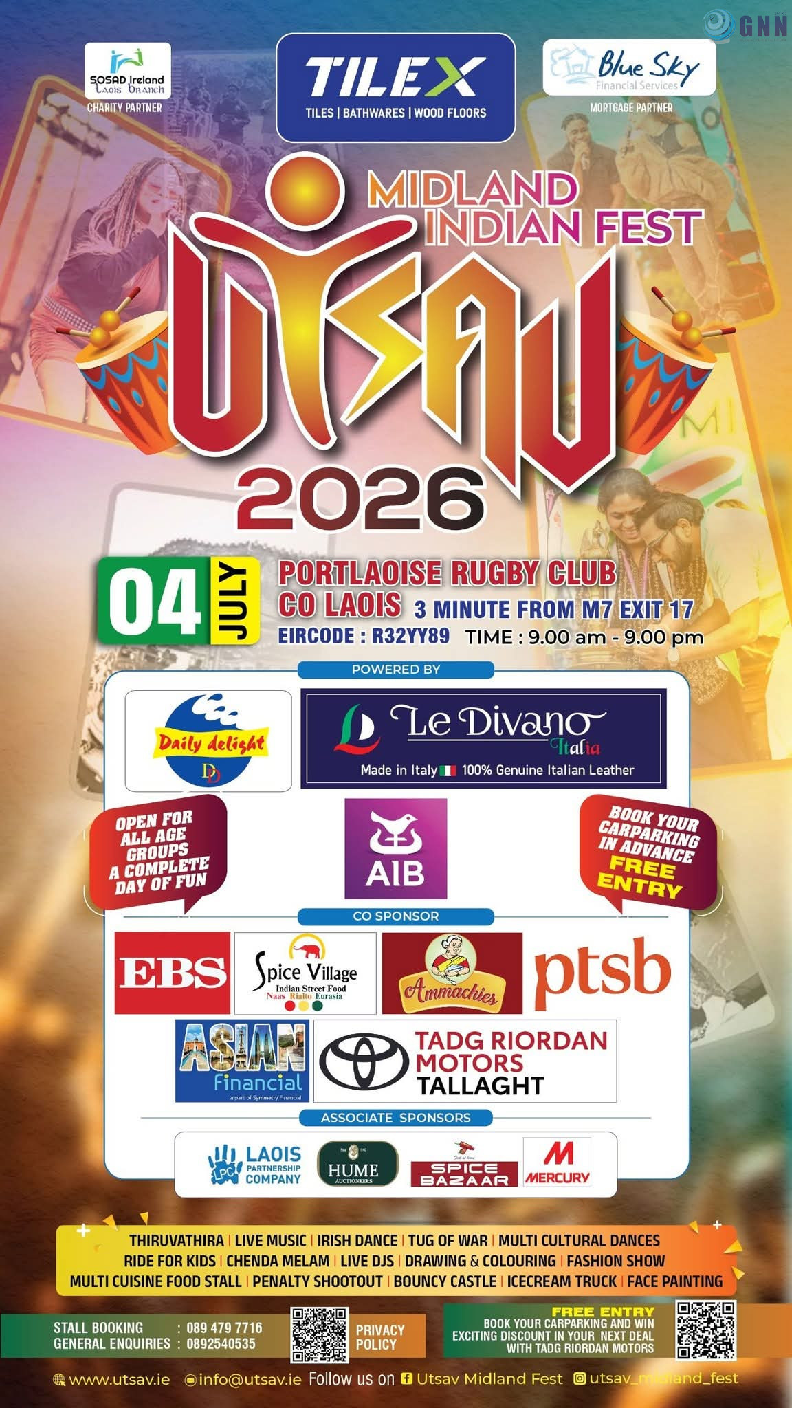 ജൂലൈ 4-ന് PORTLAOISE RUGBY ക്ലബ്ബിൽ നടക്കുന്ന മെഗാ ഫെസ്റ്റിനാ യുള്ള തയ്യാറെടുപ്പുകൾ പുരോഗമിക്കുന്നു. ആവേശം നിറയ്ക്കുന്ന ഒട്ടനവധി കലാ കായിക പരിപാടികളും, വ്യത്യസ്ത രുചി പകരാൻ ഇന്ത്യൻ ഫുഡ് സ്റ്റാളുകളും മേളയുടെ പ്രത്യേകതകളാണ്. കാണികളുടെ മനസ്സകീഴടക്കിയ UTSAV 2025ന്റെ വൻ വിജയത്തിന് പിന്നാലെ, മറ്റൊരു അവിസ്മരണീയ ആഘോഷ വേദിക്ക് സാക്ഷിയാകാൻ തയ്യാറെടുക്കുകയാണ് പോർട്ളീഷ്.