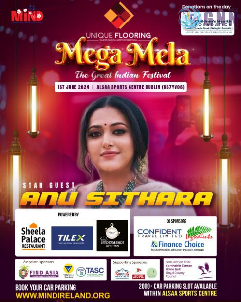 ജൂൺ ഒന്നിന് ഡബ്ലിൻ എയർപോർട്ടിന് സമീപത്തുള്ള അൽസാ സ്പോർട്സ് സെന്ററിൽ (Alsaa sports centre, K67 YV06) നടക്കുന്ന മെഗാമേളയിൽ മലയാളികളുടെ പ്രിയപ്പെട്ട സിനിമാതാരം അനു സിത്താര മുഖ്യാതിഥിയായി എത്തും.