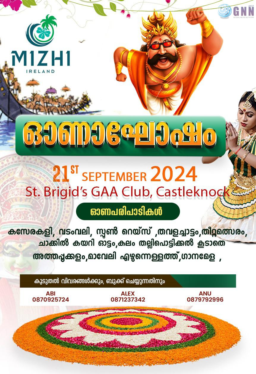 സെപ്റ്റംബർ 21, ശനിയാഴ്ച, Castleknock St. Brigid’s GAA Club ലാണ് ആഘോഷ പരിപാടികൾ സംഘടിപ്പിക്കുന്നത്. പൊന്നോണത്തിന്റെ ആവേശം നിറച്ച് വിവിധ കലാ കായിക പരിപാടികൾ അരങ്ങേറും. അയർലണ്ട് മലയാളികളുടെ ഒത്തൊരുമയുടെയും ഐക്യത്തിന്റെയും നേർ ചിത്രമൊരുക്കുന്ന പ്രവർത്തനങ്ങളുമായി മുന്നേറുന്ന മിഴി അയർലണ്ടിന്റെ ഓണഘോഷവും ഇക്കുറി കെങ്കേമമാകും.