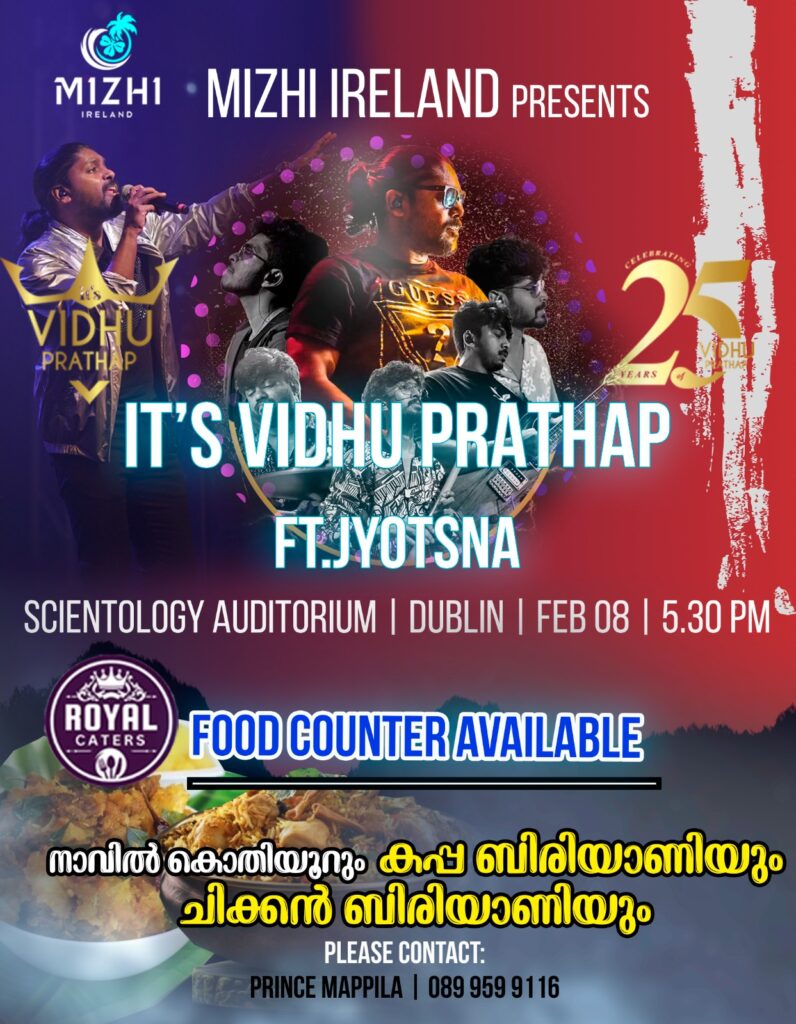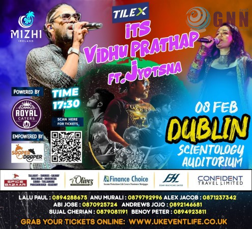 പ്രണയദിനത്തെ വരവേൽക്കാൻ അയർലണ്ട് ഒരുങ്ങുമ്പോൾ മലയാളികളുടെ പ്രിയ ഗായക ജോഡികളായ വിധുപ്രതാപും ജ്യോസ്നയും ഡബ്ലിനിലേക്ക് എത്തുന്നു. മലയാളി സംഗീതാസ്വാദകർക്ക് എവെർഗ്രീൻ റൊമാന്റിക് ഗാനകളും തകർപ്പൻ ഫാസ്റ്റ് നമ്പറുകളും കോർത്തിണക്കി ‘IT’S VIDHU PRATHAP-FT.JYOTSNA’ മെഗാ സംഗീത പരിപാടി ഇന്ന് ഡബ്ലിനിൽ അരങ്ങേറും.