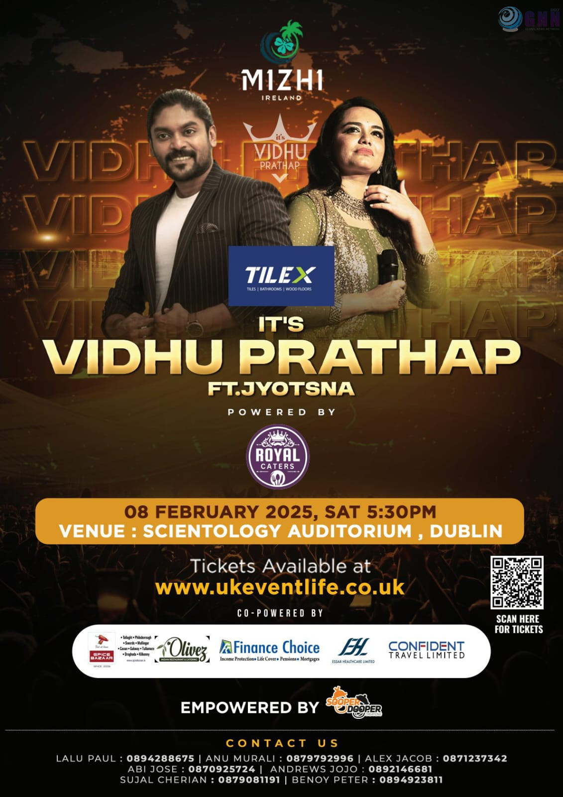 മലയാളികൾക്ക് എന്നെന്നും പ്രിയപ്പെട്ട ഗായക ജോഡികളായ വിധുപ്രതാപും ജ്യോസ്നയും ഡബ്ലിനിലേക്ക് എത്തുന്നു. ‘സുഖമാണീ നിലാവ്’ എന്ന ഒറ്റ ഗാനം മാത്രം മതി മലയാളി സംഗീതാസ്വാദകർക്ക് ഈ പ്രിയഗായകരെ ഓർക്കാൻ. ‘IT’S VIDHU PRATHAP-FT.JYOTSNA’ മെഗാ സംഗീത പരിപാടി ഫെബ്രുവരി 8ന് ഡബ്ലിനിൽ അരങ്ങേറും. മിഴി അയർലണ്ട് ആദ്യമായി ഒരുക്കുന്ന ഈ മെഗാഷോയുടെ പ്രധാന സ്പോൺസർ Tilex ആണ്.