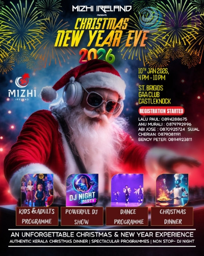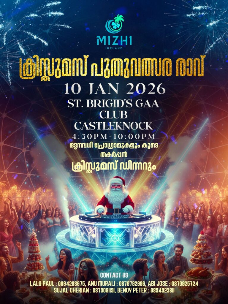 മിഴി അയർലണ്ടിന്റെ നേതൃത്വത്തിൽ, മുൻ വർഷങ്ങളിലേതുപോലെ ഈ വർഷവും ക്രിസ്തുമസ്–പുതുവത്സര ആഘോഷ സന്ധ്യ വിപുലമായി സംഘടിപ്പിക്കുന്നു.