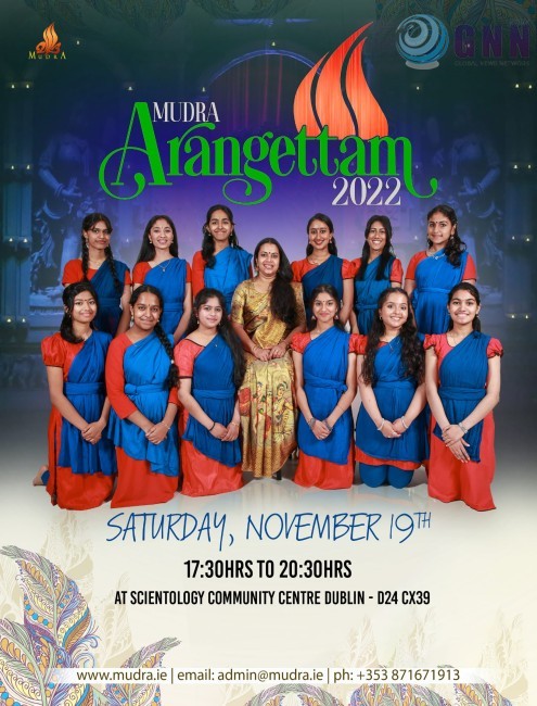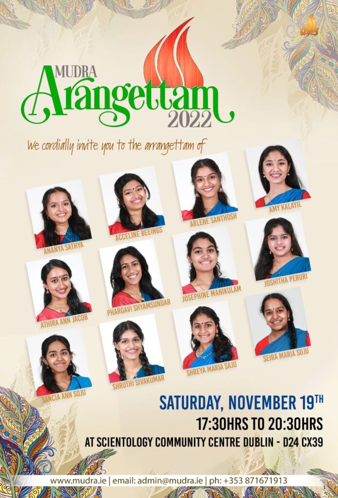 അയർലണ്ടിൽ ഇന്ത്യൻ ക്ലാസിക്കൽ നൃത്താഭ്യാസത്തിന്റെ മുഖമുദ്രയായ ”മുദ്ര സ്കൂൾ ഓഫ് ഇന്ത്യൻ ക്ലാസിക്കൽ ഡാൻസസ്” ലെ ഡബ്ലിൻ ബാച്ചിലെ വിദ്യാർഥികളുടെ അരങ്ങേറ്റം നവംബർ 19ന് നടക്കും. ഡബ്ലിനിലെ Scientology community Centre ൽ വൈകീട്ട് 5.30 നാണ് ‘അരങ്ങേറ്റം-2022’ നടക്കുന്നത്.