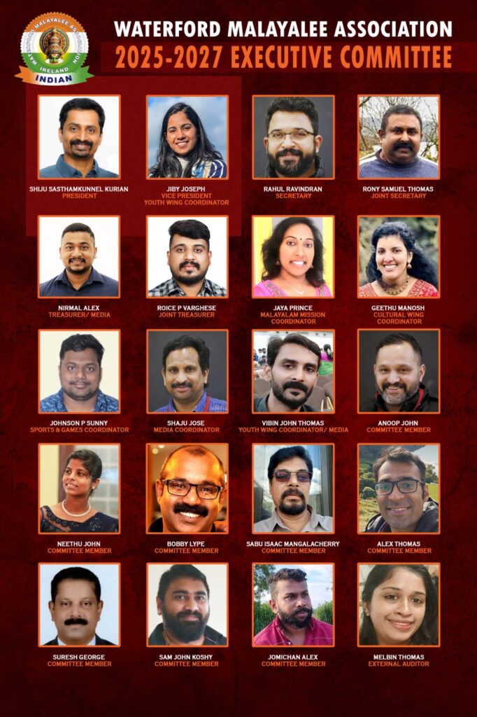 വാട്ടർഫോർഡ് : വാട്ടർഫോർഡിലെയും പരിസരപ്രദേശങ്ങളിലും പ്രവാസി മലയാളി സമൂഹത്തിൽ കഴിഞ്ഞ പതിനേഴു വർഷക്കാലമായി സജീവമായി പ്രവർത്തിക്കുന്ന വാട്ടർഫോർഡ് മലയാളി അസോസിയേഷന്റെ പുതിയ ഭരണസമിതി അംഗങ്ങളെ തിരഞ്ഞെടുത്തു. വാർഷിക പൊതുയോഗം തിരഞ്ഞെടുത്ത കമ്മിറ്റിയുടെ ആദ്യ യോഗമാണ് 2025- 2027 കാലാവധിയിലേക്കുള്ള ഭാരവാഹികളെ തിരഞ്ഞെടുത്തത്.