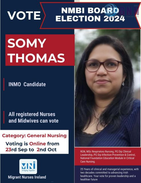 ഇന്ന് രാവിലെ ഒൻപതു മണി മുതൽ ആരംഭിച്ച് ഒക്ടോബർ രണ്ടിന്  ഉച്ചക്ക് 12 മണിക്ക് അവസാനിക്കുന്ന നഴ്സിംഗ് ബോർഡിന്റെ ബോർഡ് തിരഞ്ഞെടുപ്പിൽ  ഐറിഷ് നഴ്സസ് ആൻഡ് മിഡ്‌വൈഫറി ഓർഗനൈസേഷന്റെ (INMO) സ്ഥാനാർത്ഥിയായി ശ്രീമതി സോമി തോമസ് മത്സരിയ്ക്കുന്നു. 23 അംഗങ്ങൾ ഉള്ള നഴ്സിംഗ് ബോർഡിന്റെ ജനറൽ നഴ്സിംഗ് വിഭാഗത്തിലേക്കാണ് സോമി തോമസ് മത്സരിയ്ക്കുന്നത്. മൈഗ്രന്റ് നഴ്സസ് അയർലണ്ടിന്റെ ദേശീയ ട്രെഷറർ ആയി പ്രവർത്തിച്ചു വരുന്ന സോമി തോമസ് നാളിതുവരെയായി നൂറു കണക്കിന് നഴ്സുമാരെ വിവിധ വിഷയങ്ങളിൽ സഹായിക്കുകയും അവരുടെ പ്രശ്ന പരിഹാരത്തിനായി സജീവമായി പ്രവർത്തിച്ചു വരികയും ചെയ്യുന്നു.