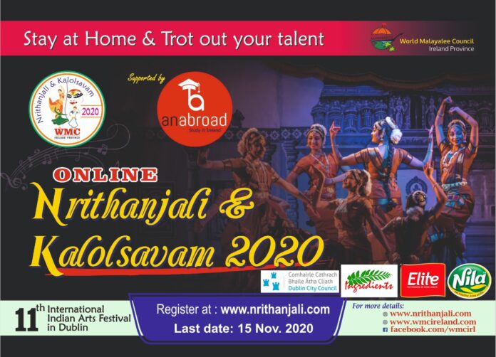 ഡബ്ലിൻ: വേൾഡ് മലയാളി കൗണ്സിൽ അയർലണ്ട് പ്രോവിന്സിന്റെ പതിനൊന്നാമത് ‘നൃത്താഞ്ജലി & കലോത്സവം 2020 ‘ത്തിനുള്ള ഓൺലൈൻ രജിസ്ട്രേഷൻ ആരംഭിച്ചു. കോവിഡ് 19 മഹാമാരിയുടെ പശ്ചാത്തലത്തില് ഇത്തവണ മത്സരങ്ങള് ഓണ്ലൈനായാണ് നടത്തപ്പെടുന്നത്.