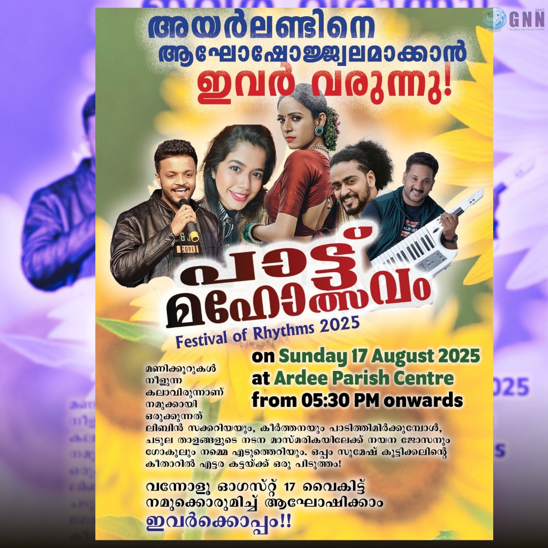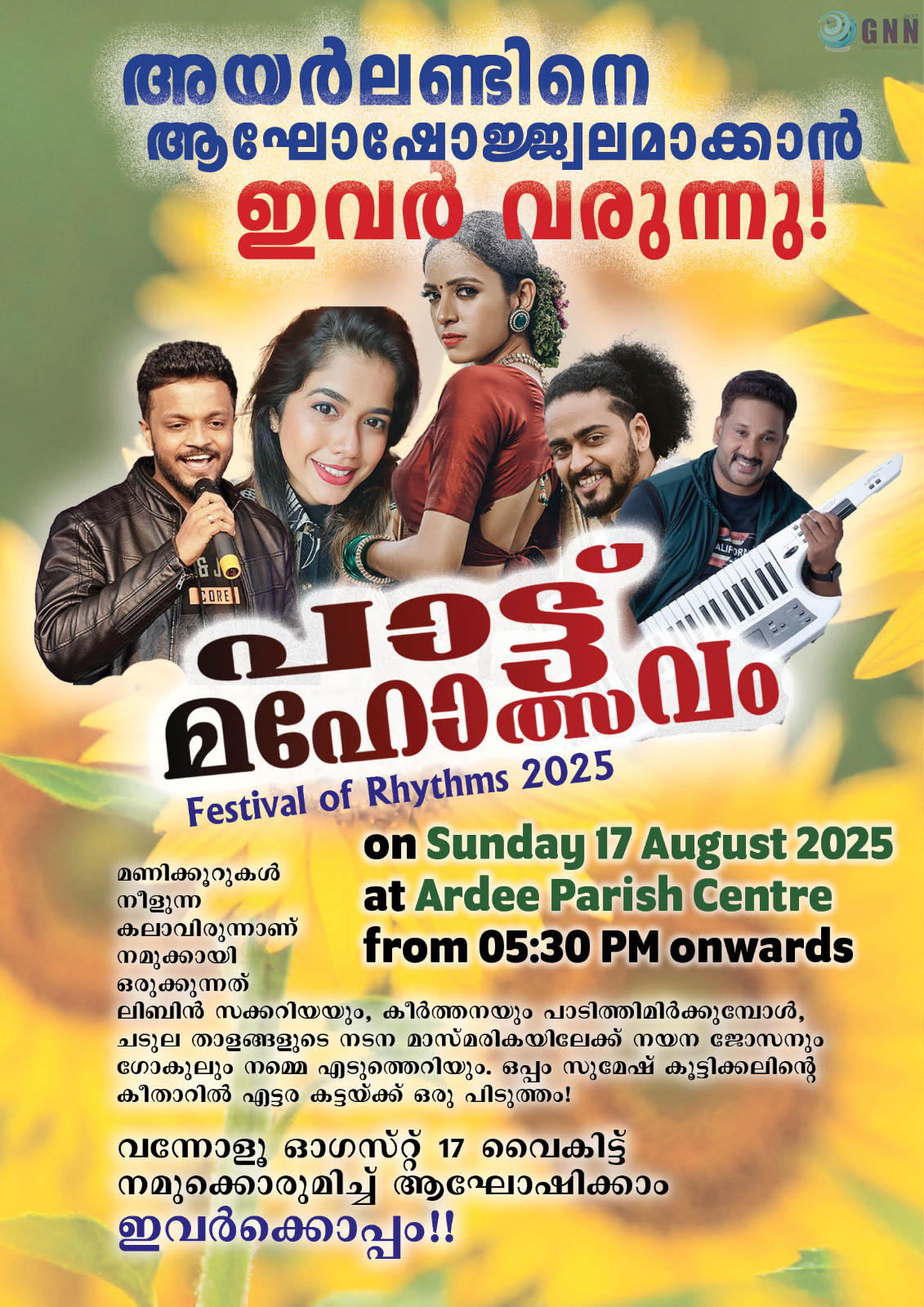ഈ പൊന്നോണക്കാലത്തെ ആടിത്തിമിർത്ത് നമുക്ക് വരവേൽക്കാം. പാട്ട് മഹോത്സവം: Festival of Rhythms 2025 ഓഗസ്റ്റ് 17ന് നടക്കും. മലയാളികളുടെ പ്രിയ ഗായകർ ലിബിൻ സക്കറിയയും, കീർത്തനയും സംഗീതത്തിന്റെ പുതു വസന്തം തീർക്കുമ്പോൾ, ചടുല താളങ്ങളുടെ നടന മാസ്മരികത ഒരുക്കി നയന ജോസനും ഗോകുലും നിങ്ങൾക്ക് മുന്നിലേക്ക് എത്തുന്നു. ഒപ്പം കീതാറിൽ വിസ്മയം തീർക്കാൻ സുമേഷ് കൂട്ടിക്കലുമുണ്ട്. ഓഗസ്റ്റ് 17 വൈകുന്നേരം 5.30 മണി മുതൽ Ardee Parish Centre ൽ കലാ സന്ധ്യ അരങ്ങേറും. ഇപ്പോൾ തന്നെ രജിസ്റ്റർ ചെയ്യാം.