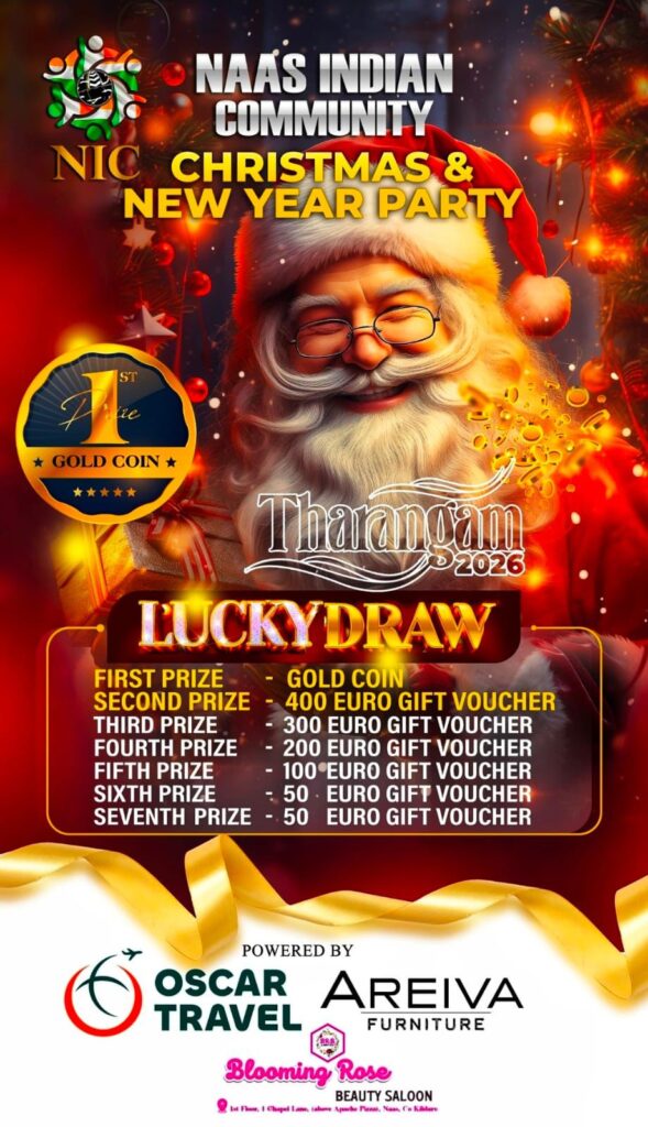 NAAS ഇന്ത്യൻ കമ്മ്യൂണിറ്റി സംഘടിപ്പിക്കുന്ന ക്രിസ്മസ് ന്യൂ ഇയർ ആഘോഷം “Tharangam 2026” ജനുവരി 10ന്. Curagh ഹാളിൽ നടക്കുന്ന ഈ ആഘോഷരാവിൽ, നിങ്ങളിലെ ഭാഗ്യശാലികൾക്കായി ആകർഷകമായ നിരവധി സമ്മാനങ്ങളും കാത്തിരിക്കുകയാണ്. ലക്കി ഡ്രോയിലൂടെ തിരഞ്ഞെടുക്കുന്നവർക്ക് ഒന്നാം സമ്മാനം ഗോൾഡ് കോയിൻ ആണ്‌.