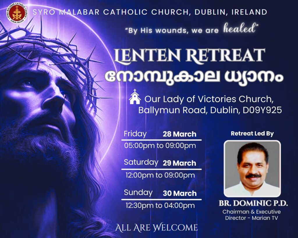 ഡബ്ലിൻ : ഡബ്ലിന് സീറോ മലബാര് സഭയുടെ നോമ്പ്കാല ധ്യനം മാർച്ച് 28 വെള്ളിയാഴ്ച ആരംഭിക്കും. 2025 മാർച്ച് 28, 29, 30 (വെള്ളി, ശനി, ഞായർ) ദിവസങ്ങളിൽ ഡബ്ലിൻ ബാലിമൺ റോഡിലുള്ള ഗ്ലാസ്നേവിൻ ഔർ ലേഡി ഓഫ് വിക്ടറീസ് ദേവാലയത്തിലാണ് (Our Lady of Victories Catholic Church,Ballymun Rd, Glasnevin, Dublin, D09 Y925) ഈ വർഷത്തെ ധ്യാനം നടക്കുക. വെള്ളിയാഴ്ച് വൈകിട്ട് അഞ്ചുമുതൽ ഒൻപത് വരെയും ശനിയാഴ്ച് ഉച്ചക്ക് പന്ത്രണ്ട് മുതൽ വൈകിട്ട് ഒൻപത് വരെയും ഞായറാഴ്ച് ഉച്ചയ്ക്ക് 12:30 മുതൽ നാലുവരെയുമാണ് ധ്യാനം നടക്കുക. ധ്യാനം നടക്കുന്ന മൂന്നു ദിവസവും വിശുദ്ധ കുർബാനയ്ക്കും, ആരാധനക്കും, വചന പ്രഘോഷണത്തിനുമൊപ്പം കുമ്പസാരത്തിനുള്ള സൗകര്യവും ഉണ്ടായിരിക്കും.