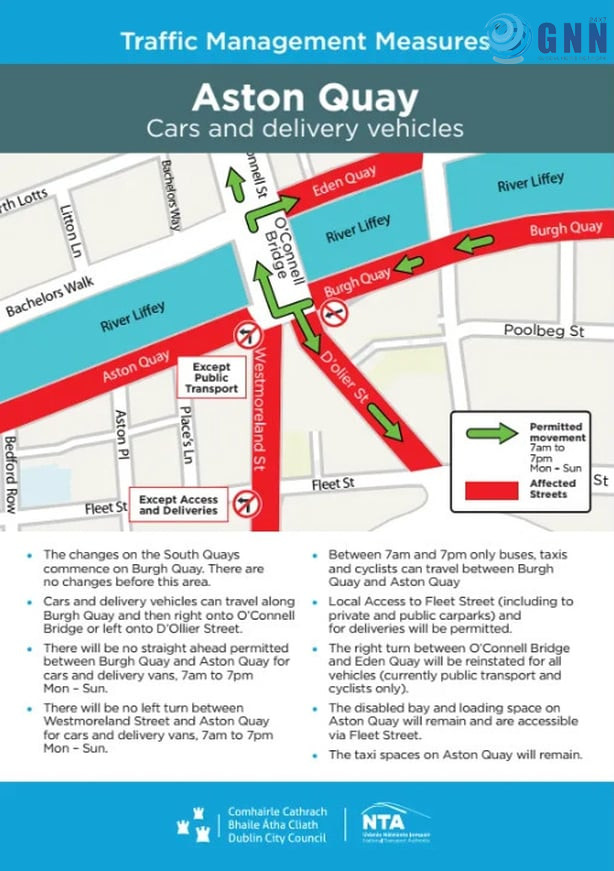 ഡബ്ലിൻ സിറ്റി സെൻ്ററിലെ north, south quays ൽ സ്വകാര്യ വാഹനങ്ങൾ സഞ്ചരിക്കുന്നതിനുള്ള നിരോധനം പ്രാബല്യത്തിൽ. നഗരത്തിലൂടെ സഞ്ചരിക്കുന്ന കാറുകളും ഡെലിവറി വാനുകളും ഈ പ്രദേശങ്ങളിൽ പാർക്ക് ചെയ്യാതെ ഇരിക്കുന്നതിനാണ് ഗതാഗത പദ്ധതിയുടെ ആദ്യ ഘട്ടം രൂപകൽപ്പന ചെയ്തിരിക്കുന്നതെന്ന് ഡബ്ലിൻ സിറ്റി കൗൺസിൽ അറിയിച്ചു. എന്നിരുന്നാലും, നടപടികൾ ബിസിനസിൽ ഉണ്ടാക്കിയേക്കാവുന്ന പ്രത്യാഘാതങ്ങളെക്കുറിച്ച് ചില്ലറ വ്യാപാരികൾ ആശങ്ക പ്രകടിപ്പിച്ചു. കഴിഞ്ഞ ഒരു വർഷമായി ചർച്ച ചെയ്യപ്പെടുകയും ഭേദഗതി ചെയ്യുകയും ചെയ്ത പദ്ധതി ഇന്ന് മുതൽ നഗരമധ്യത്തിൽ സ്വകാര്യ വാഹനങ്ങൾ സഞ്ചരിക്കുന്ന രീതിയെ ഗണ്യമായി മാറ്റും.