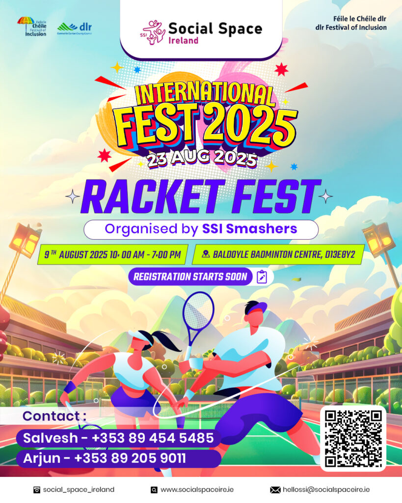 കൂടാതെ കായിക പ്രേമികൾക്കായി SSI Smashers സംഘടിപ്പിക്കുന്ന ‘RACKET FEST’ അരങ്ങേറും. ഓഗസ്റ്റ് 9ന് -BALDOYLE BADMINTON CENTRE- ലാണ് മത്സരം നടക്കുന്നത്. മത്സരത്തിൽ പങ്കെടുക്കാൻ താല്പര്യമുള്ളവർക്ക് രജിസ്റ്റർ ചെയ്യാം.