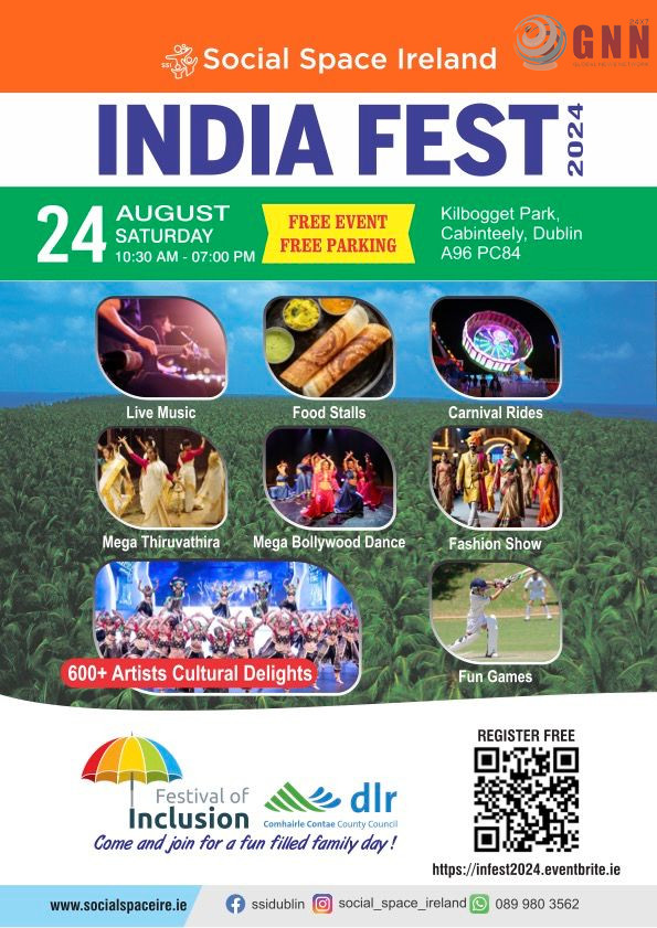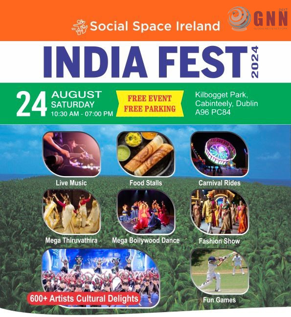 ഇന്ത്യൻ പൈതൃകവും സാംസ്കാരിക തനിമയും വിളിച്ചോതുന്ന അയർലണ്ടിലെ ഇന്ത്യൻ സമൂഹത്തിന്റെ ഏറ്റവും വലിയ സംഗമമായ INDIA FEST ഓഗസ്റ്റ് 24, ശനിയാഴ്ച നടക്കും. Social Space Ireland ന്റെ ആഭിമുഖ്യത്തിലാണ് ഫെസ്റ്റ് സംഘടിപ്പിക്കുന്നത്. ഡബ്ലിനിലെ Cabinteelyലെ Kilbogget Park ലാണ് പരിപാടികൾ നടക്കുക. രാവിലെ 10. 30ന് കായിക മത്സരങ്ങളോടെ ഫെസ്റ്റിന് തുടക്കമാകും. ജോർജിയ , ബ്രസീൽ , സ്ലോവാക്കിയ , പെറു , ഫിലിപിനോസ് , മലേഷ്യ തുടങ്ങി വിവിധ രാജ്യങ്ങളിൽ നിന്നും കലാ- സാംസ്കാരിക പരിപാടികൾ മേളയിൽ അരങ്ങേറും. ഫെസ്റ്റിൽ പ്രവേശനവും പാർക്കിങ്ങും സൗജന്യമാണ്. പബ്ലിക് ട്രാൻസ്പോർട്ട് വഴിയും വേദിയിൽ എത്താം.
