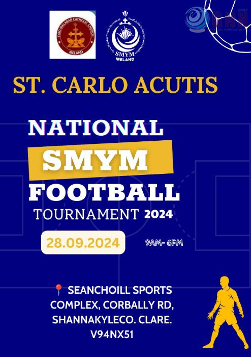 ലിമറിക്ക്: സീറോ മലബാർ യുവജന പ്രസ്ഥാനം (SMYM) അയർലണ്ടിന്റെ ആഭിമുഖ്യത്തിൽ സെന്റ് കാർലോ അക്ക്യൂട്ടിസ് ഫുട്ബോൾ ടൂർണമെന്റ് സെപ്റ്റംബർ 28 ശനിയാഴ്ച ലിമറിക്കിലെ സാൻചോയിൽ സ്പോർട്സ് കോംപ്ലക്സിൽ (Seanchoill Sports Complex, Corbally Road, Eircode: V94 NX51) നടത്തപ്പെടും. അയർലണ്ടിന്റെ വിവിധ ഭാഗങ്ങളിൽ നിന്നുള്ള 9 ടീമുകൾ പങ്കാളികളാകുന്ന ഈ ടൂർണമെന്റ് രാവിലെ 9:30 ന് ആരംഭിച്ച് ഒരേ ദിവസത്തിൽ പൂർത്തിയാക്കും. മത്സരങ്ങൾ രണ്ട് ഗ്രൗണ്ടുകളിലായി നടക്കും.