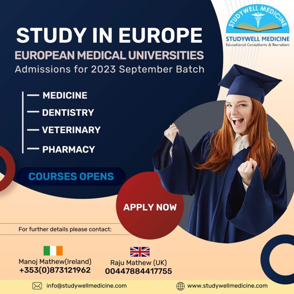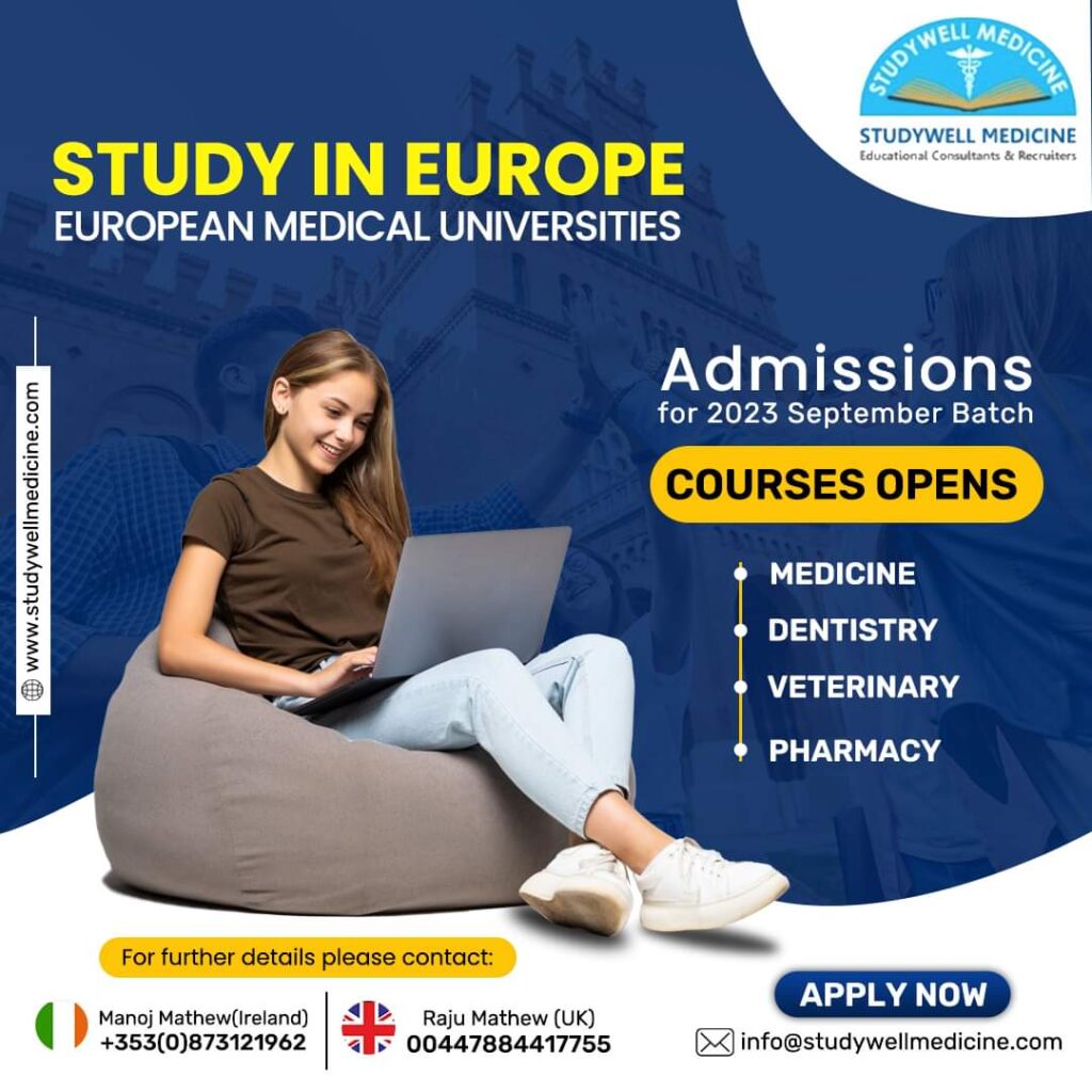 യൂറോപ്പിലെ പ്രമുഖ ആരോഗ്യ സർവകലാശാലകളിൽ മെഡിസിൻ, ഡെൻറിസ്ട്രി, വെറ്റിനറി, ഫാർമസി, ഫിസിയോതെറാപ്പി, നഴ്സിംഗ് കോഴ്സുകളിലേക്കുള്ള(2023-24) അഡ്മിഷൻ ആരംഭിച്ചു. സെപ്റ്റംബർ ബാച്ചിലേക്കുള്ള അഡ്മിഷൻ ആരംഭിച്ചിരിക്കുകയാണ് STUDYWELL MEDICINE Educational Consultants & Recruiters.