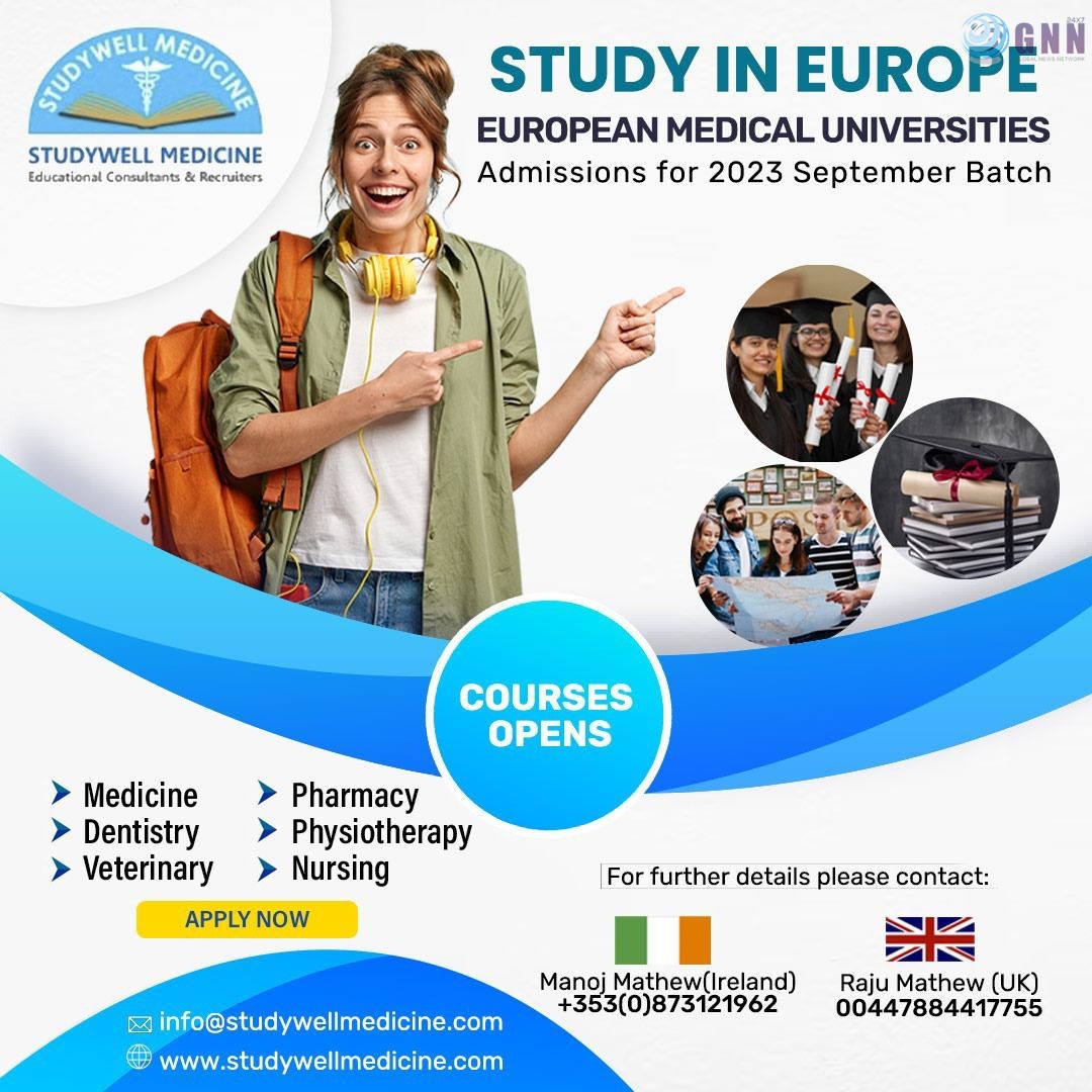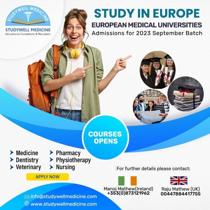 യൂറോപ്പിലെ പ്രമുഖ ആരോഗ്യ സർവകലാശാലകളിൽ മെഡിസിൻ, ഡെൻറിസ്ട്രി, വെറ്റിനറി, ഫാർമസി, ഫിസിയോതെറാപ്പി, നഴ്സിംഗ് കോഴ്സുകളിലേക്കുള്ള(2023-24) അഡ്മിഷൻ ആരംഭിച്ചു. സെപ്റ്റംബർ ബാച്ചിലേക്കുള്ള അഡ്മിഷൻ ആരംഭിച്ചിരിക്കുകയാണ് STUDYWELL MEDICINE Educational Consultants & Recruiters.