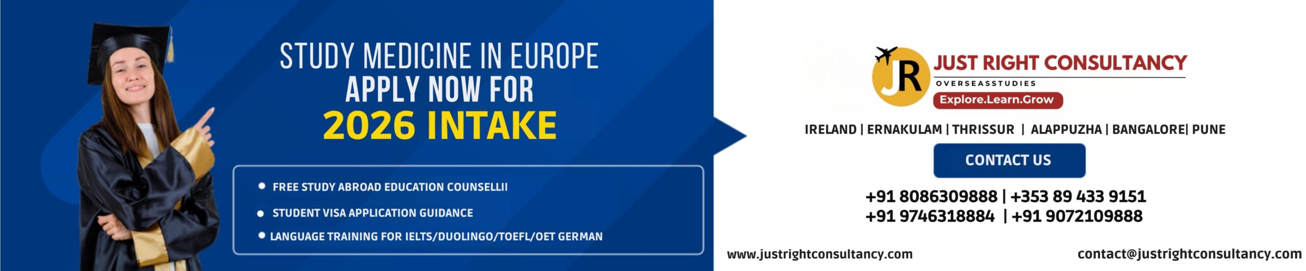 അഡ്മിഷൻ നേടാൻ IELTS, PTE ആവശ്യമില്ല. 70% മാർക്കോടെ +2 യോഗ്യത നേടിയവർക്ക് അപേക്ഷിക്കാം. പ്ലസ് ടു ഫിസിക്സ്, കെമിസ്ട്രി, ബിയോളജി ഐശ്ചിക വിഷയമായി എടുത്തവർക്കാണ് മെഡിക്കൽ പ്രവേശനം ലഭിക്കുക. ആയിരക്കണക്കിന് വിദ്യാർത്ഥികളുടെ വിദേശ പഠനം സ്വപ്നം യാഥാർഥ്യമാക്കിയ JUST RIGHT Consultancy ഒരുക്കുന്ന ഈ അവസരം ധൈര്യപൂർവ്വം നിങ്ങൾക്ക് സ്വന്തമാക്കാം. വിദേശ റിക്രൂട്ട്മെന്റ് രംഗത്ത് പതിറ്റാണ്ടുകളുടെ സുതാര്യ സേവന പാരമ്പര്യം ഉറപ്പ് നൽകുന്ന JUST RIGHT Consultancy തന്നെ ആകട്ടെ നിങ്ങളുടെ വഴികാട്ടി.