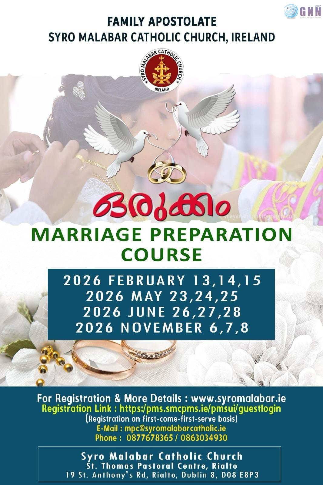 ഡബ്ലിൻ: അയർലണ്ട് സീറോ മലബാർ സഭയുടെ ഫാമിലി അപ്പസ്തോലേറ്റ് സംഘടിപ്പിക്കുന്ന വിവാഹ ഒരുക്ക സെമിനാർ – ഒരുക്കം 2026 ഫെബ്രുവരി, മെയ്, ജൂൺ, നവംബർ മാസങ്ങളിൽ നടത്തപ്പെടും. ഈ വർഷം നടക്കാനിരിക്കുന്ന കോഴ്സുകളിലേക്കുള്ള രജിസ്ട്രേഷൻ നിലവിൽ പുരോഗമിച്ചുകൊണ്ടിരിക്കുകയാണ്.