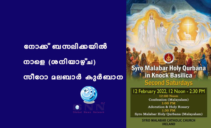 നോക്ക് : അന്താരാഷ്ട്ര ദിവ്യകാരുണ്യ മരിയൻ തീർത്ഥാടന കേന്ദ്രമായ നോക്കിലെ ബസലിക്കയിൽ നാളെ (ഫെബ്രുവരി 12 ശനിയാഴ്ച്) സീറോ മലബാർ വിശുദ്ധ കുർബാന നടക്കും. ഉച്ചക്ക് 12 മണിമുതൽ മലയാളത്തിൽ കുമ്പസാരത്തിനുള്ള സൗകര്യം ഉണ്ടായിരിക്കും. 1 മണിമുതൽ ബസലിക്കയിൽ ദിവ്യകാരുണ്യ ആരാധനയും ജപമാലയും. തുടർന്ന് 1:30 നു സീറോ മലബാർ വിശുദ്ധ കുർബാന (മലയാളം).