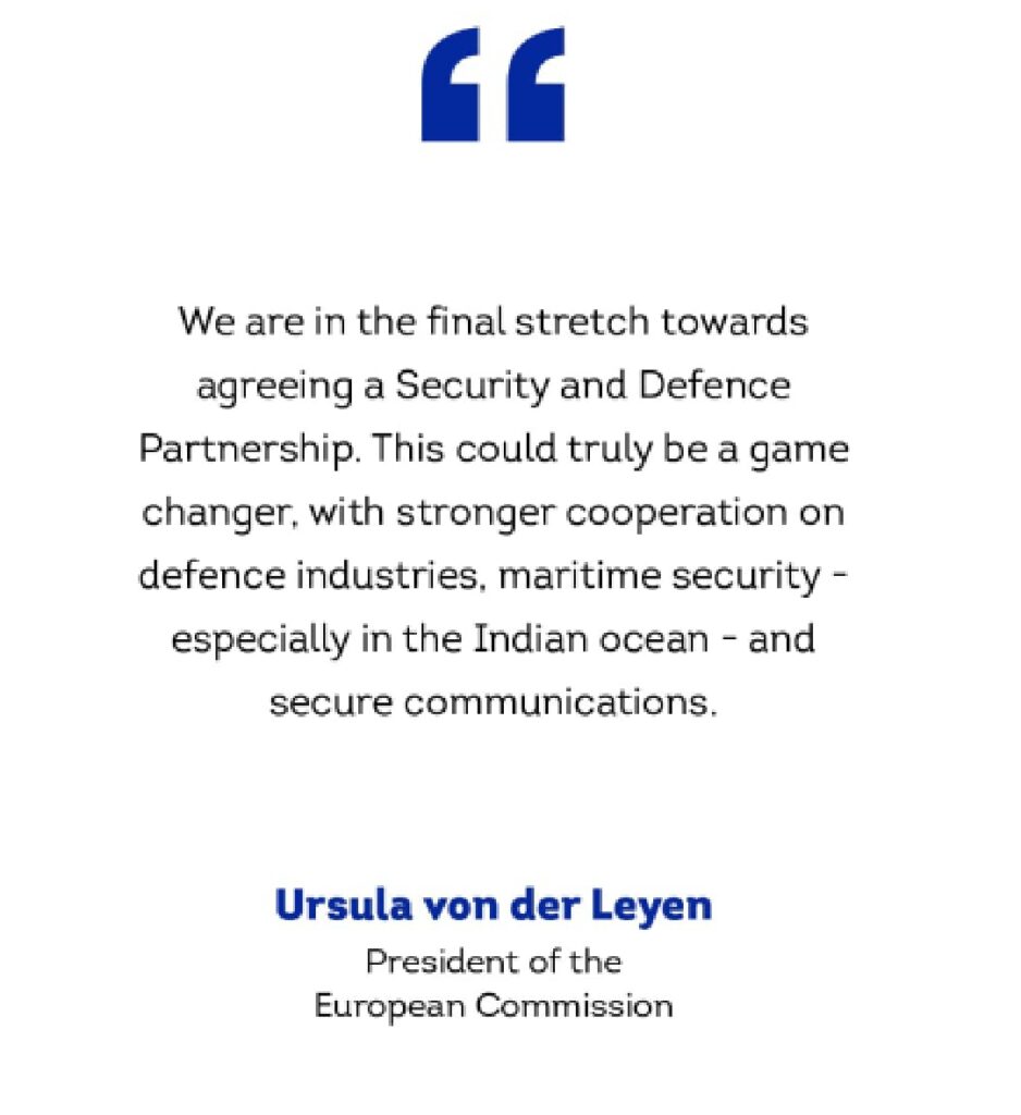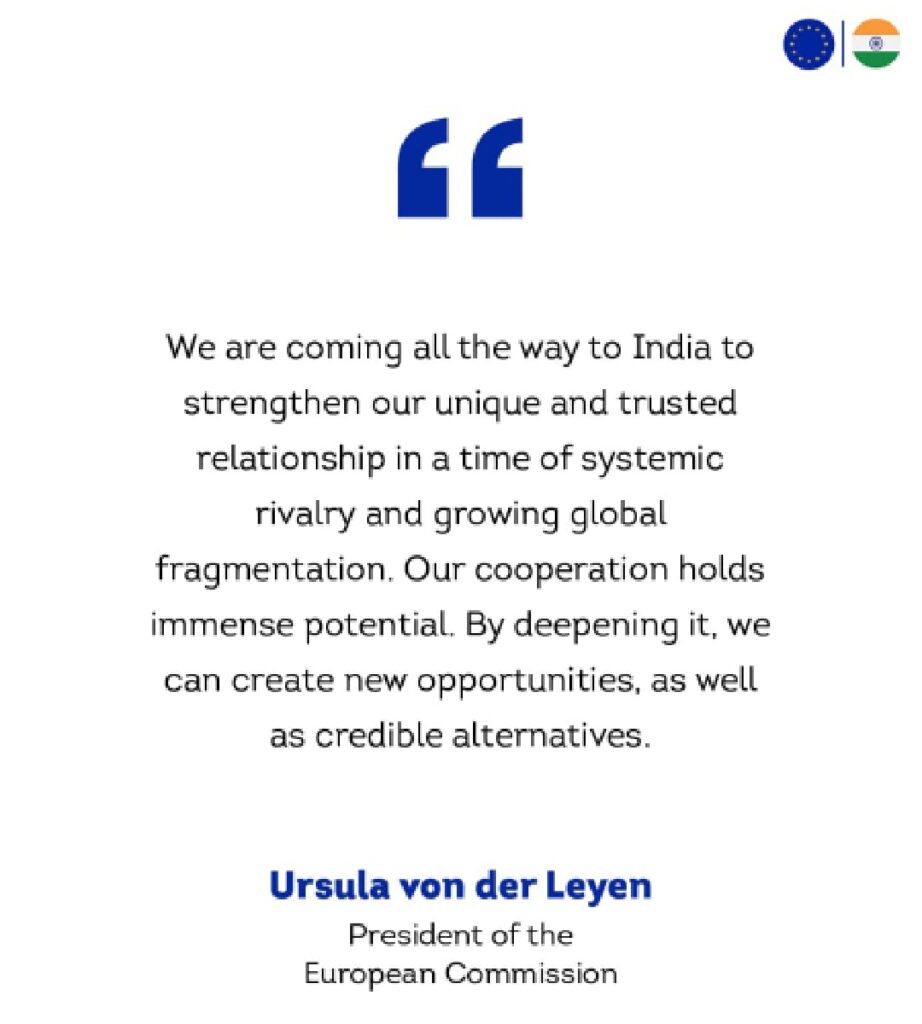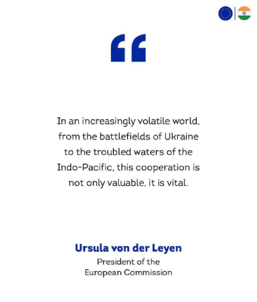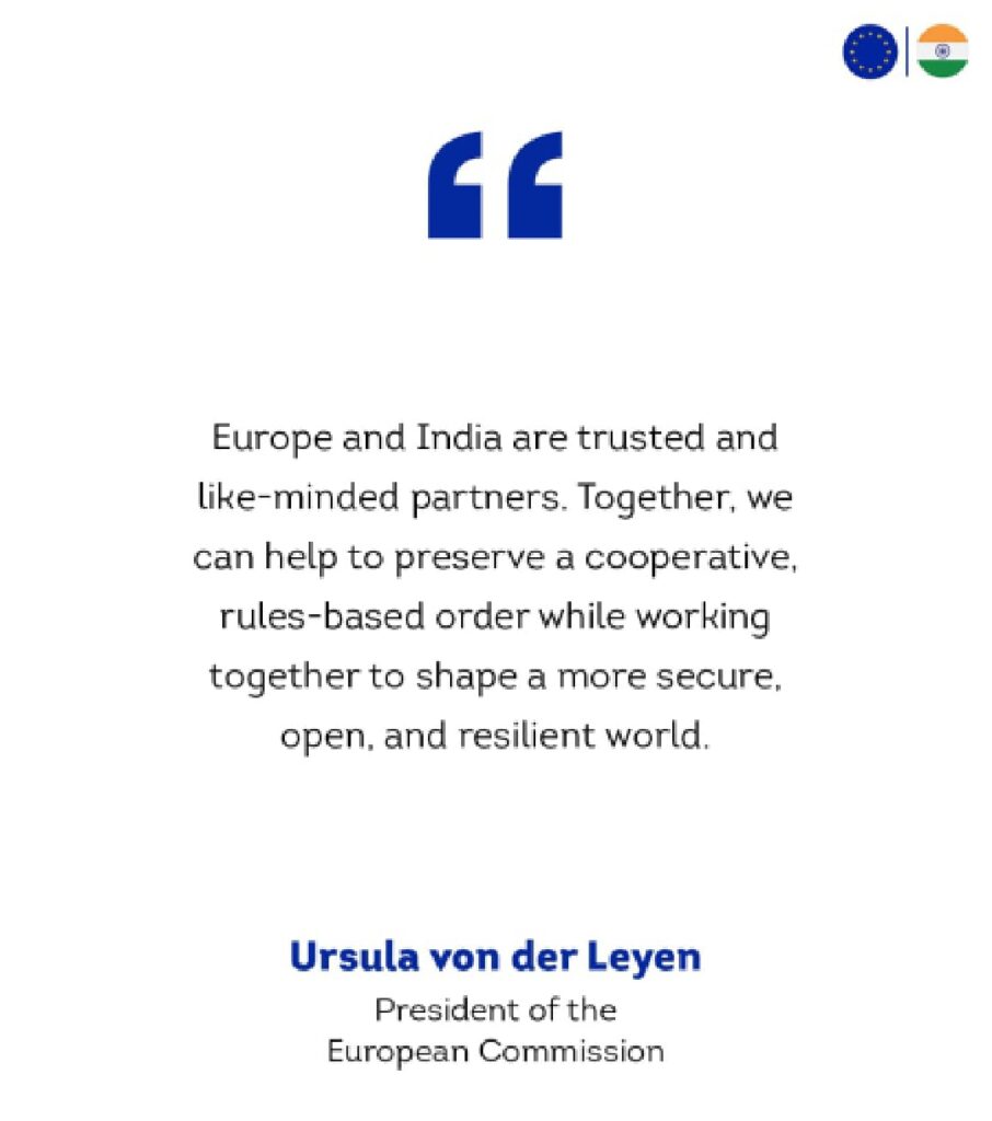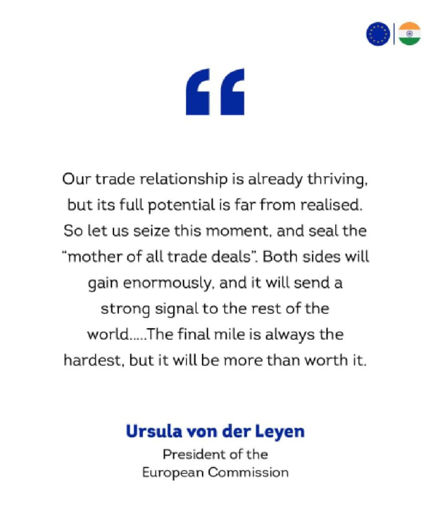 കരാർ രാജ്യങ്ങൾ തമ്മിലുള്ള പങ്കാളിത്തത്തിന്റെ ഉത്തമ ഉദാഹരണമാണെന്നു പറഞ്ഞ മോദി കരാറിനെ ‘എല്ലാ കരാറുകളുടെയും മാതാവ്’ എന്നും വിശേഷിപ്പിച്ചു.ഇന്ത്യയും യൂറോപ്യൻ യൂണിയനും വിജയകരമായി ചർച്ചകൾ പൂർത്തിയാക്കിയതായും ജനുവരി 27 ചൊവ്വാഴ്ച സ്വതന്ത്ര വ്യാപാര കരാർ (എഫ്.ടി.എ) പ്രഖ്യാപിക്കുമെന്നും വ്യവസായ സെക്രട്ടറി രാജേഷ് അഗർവാൾ നേരത്തെ പറഞ്ഞിരുന്നു. ഈ നീക്കം ഉൽപ്പാദന മേഖലയ്ക്കും സേവന മേഖലയ്ക്കും വലിയ ഉത്തേജനമാകുമെന്ന് പ്രധാനമന്ത്രി മോദി പറഞ്ഞു.ഈ കരാർ ആഗോള ജി.ഡി.പി യുടെ 25% വും, ആഗോള വ്യാപാരത്തിൻ്റെ മൂന്നിലൊന്നും ഉൾകൊള്ളുന്നതാണെന്നും അദ്ദേഹം പറഞ്ഞു.