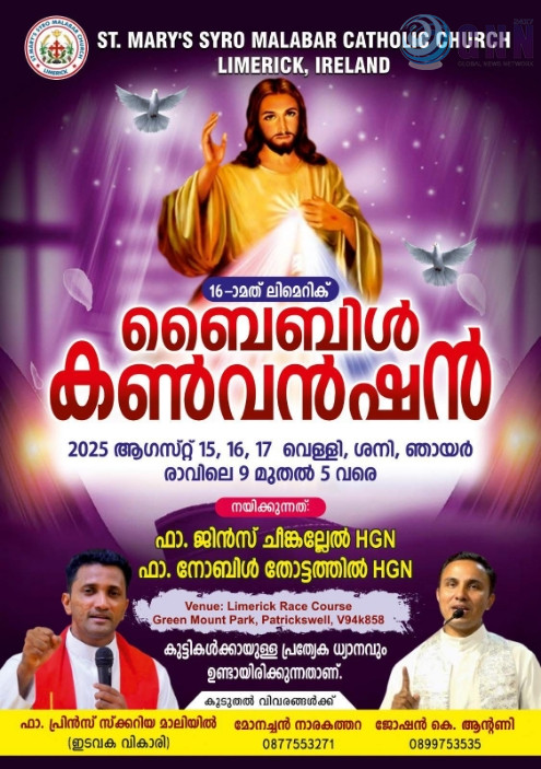 ലിമെറിക്ക് : സെന്റ് മേരീസ് സീറോ മലബാർ ചർച്ച്‌ ലിമെറിക്കിന്റെ ആഭിമുഖ്യത്തിൽ എല്ലാ വർഷവും നടത്തി വരാറുള്ള  ‘ലിമെറിക് ബൈബിൾ കൺവെൻഷൻ ,ഈ വർഷം ഓഗസ്റ്റ്  15,16,17,(വെള്ളി ,ശനി ,ഞായർ ) ദിവസങ്ങളിൽ രാവിലെ  9 മുതൽ വൈകിട്ട് 5 വരെ ലിമെറിക്ക് ,പാട്രിക്‌സ്വെൽ റേസ് കോഴ്സ് ഓഡിറ്റോറിയത്തിൽ വെച്ച് നടത്തപ്പെടും.കോട്ടയം പാമ്പാടി ,ഗുഡ്ന്യൂസ് ധ്യാനകേന്ദ്രത്തിലെ ധ്യാനഗുരുക്കന്മാരായ ഫാ.ജിൻസ് ചീങ്കല്ലേൽ HGN,ഫാ.നോബിൾ തോട്ടത്തിൽ HGN എന്നിവരാണ് ഈ വർഷത്തെ കൺവെൻഷൻ നയിക്കുന്നത്.