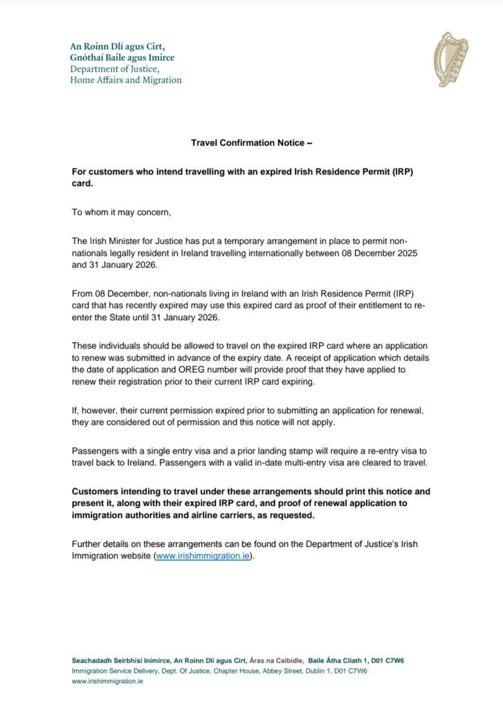 2025 ഡിസംബർ 08 നും 2026 ജനുവരി 31 നും ഇടയിൽ അയർലണ്ടിൽ നിയമപരമായി താമസിക്കുന്ന വിദേശികൾക്ക് അന്താരാഷ്ട്ര തലത്തിൽ യാത്ര ചെയ്യാൻ അനുമതി നൽകുന്നതിനായി താൽക്കാലിക ക്രമീകരണം ഏർപ്പെടുത്തിയതായി ഐറിഷ് നീതിന്യായ മന്ത്രി അറിയിച്ചു. അടുത്തിടെ കാലഹരണപ്പെട്ട ഐറിഷ് റെസിഡൻസ് പെർമിറ്റ് (IRP) കാർഡുള്ള അയർലണ്ടിൽ താമസിക്കുന്ന സ്വദേശികളല്ലാത്തവർക്ക്,ഡിസംബർ 08 മുതൽ 2026 ജനുവരി 31 വരെ രാജ്യത്ത് വീണ്ടും പ്രവേശിക്കുന്നതിനായി ഈ കാലഹരണപ്പെട്ട കാർഡ് ഉപയോഗിക്കാം.