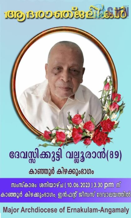 അയർലൻഡ് മലയാളി സെബി സെബാസ്റ്റ്യൻ്റെ പിതാവ് വല്ലൂരാൻ ദേവസ്സിക്കുട്ടി (89) നിര്യാതനായി. എറണാകുളം-അങ്കമാലി അതിരൂപതയിലെ ഇല്ലിത്തോട് തിരുഹൃദയ പള്ളി വികാരി  ബഹു. ജോൺസൺ വല്ലൂരാൻ മറ്റൊരു മകനാണ്. മൃതസംസ്കാരശുശ്രൂഷ ശനിയാഴ്ച (10.06.2023) ഉച്ചകഴിഞ്ഞ് 3.30 മണിക്ക് കാഞ്ഞൂർ കിഴക്കുംഭാഗം ഇൻഫൻറ് ജീസസ് പള്ളി സെമിത്തേരിയിൽ നടക്കും. മൃതദേഹം ശനിയാഴ്ച രാവിലെ 8 മണി മുതൽ  ഭവനത്തിൽ പൊതുദർശനത്തിന് വയ്ക്കുന്നതാണ്. പരേതനുവേണ്ടി നമുക്ക് പ്രത്യേകം  പ്രാർത്ഥിക്കാം.