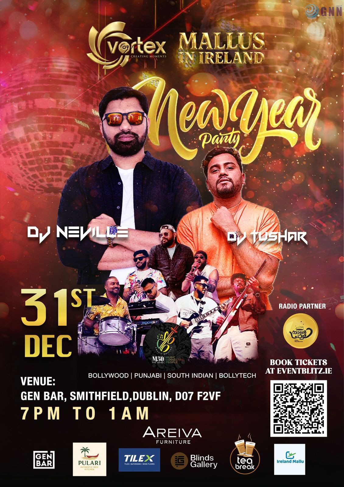 പുതിവർഷ പുലരിയെ ആഘോഷപൂർവം വരവേൽക്കാൻ അയർലണ്ട് ഒരുങ്ങുകയാണ്. Vortex, Mallus In Ireland സംഘടിപ്പിക്കുന്ന Newyear Party ഡിസംബർ 31ന് നടക്കും. ആഘോഷം ആർത്തിരമ്പുന്ന രാവിൽ സംഗീത വിസ്മയം തീർക്കാൻ Dj NEVILLE, Dj TUSHAR നയിക്കുന്ന സംഘം എത്തുന്നു. ഡബ്ലിൻ SMITHFIELD, GEN BAR ൽ രാത്രി 7 മണി മുതൽ ന്യൂ ഇയർ പാർട്ടി ആരംഭിക്കും. ടിക്കറ്റുകൾ ഇപ്പോൾ തന്നെ ബുക്ക് ചെയ്യുക.
