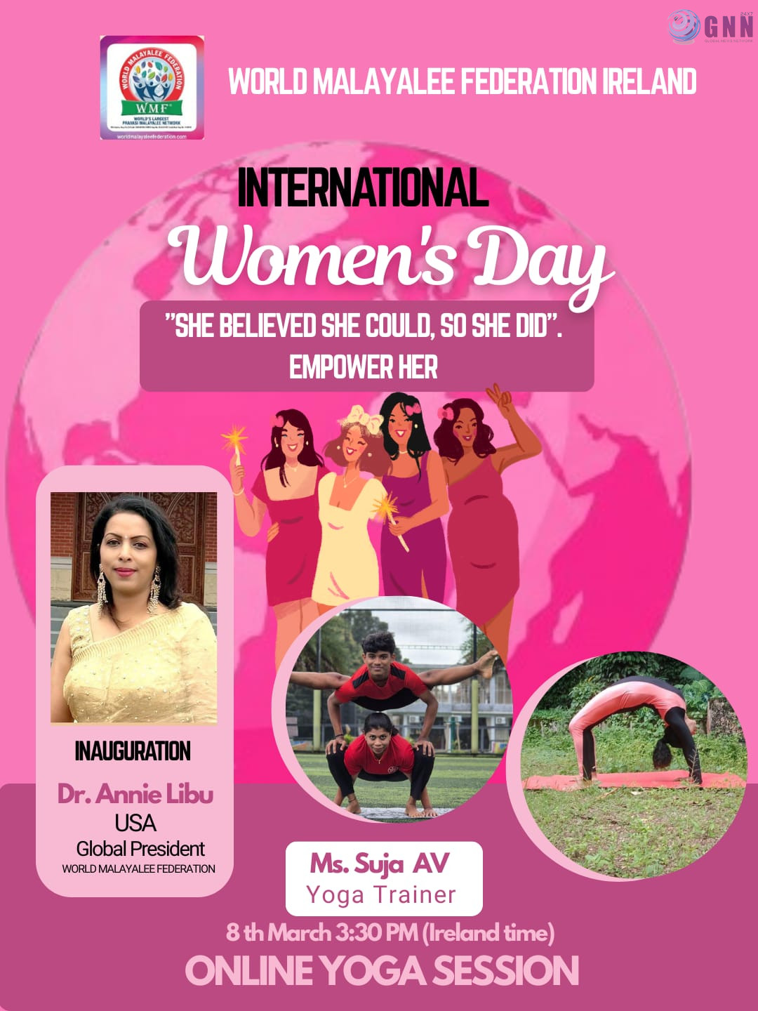 അന്താരാഷ്ട്ര വനിതാ ദിനത്തിൽ വിപുലമായ ആഘോഷപരിപാടികൾ സംഘടിപ്പിച്ച് വേൾഡ് മലയാളി ഫെഡറേഷൻ അയർലണ്ട്. അന്താരാഷ്ട്ര വനിതാ ദിനമായ മാർച്ച് 8, ഞായറാഴ്ച വനിതകൾക്കായി ഓൺലൈൻ യോഗ സെഷൻ നടത്തും.