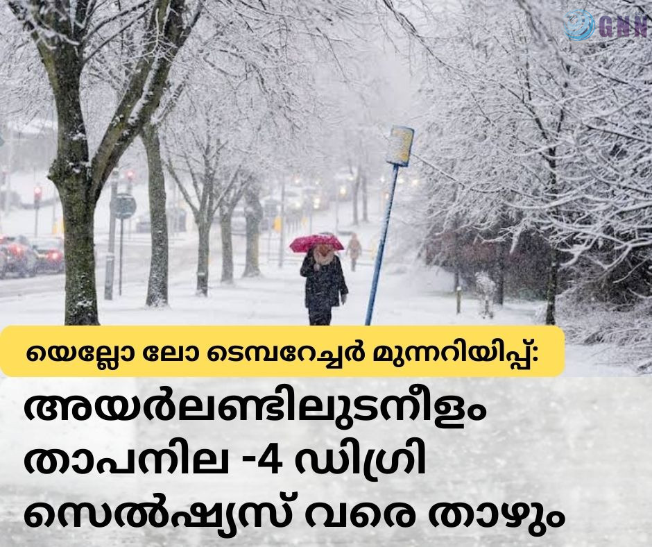 നാളെ അയർലണ്ടിലെമ്പാടും താപനില -4 ഡിഗ്രി സെൽഷ്യസ് വരെ താഴുന്നതിനാൽ സ്റ്റാറ്റസ് യെല്ലോ ലോ ടെമ്പറേച്ചർ മുന്നറിയിപ്പ് നൽകിയിട്ടുണ്ട്. ഇന്ന് രാവിലെയാണ് മെറ്റ് ഐറാൻ മുന്നറിയിപ്പ് നൽകിയത്, കഠിനമായ മഞ്ഞുവീഴ്ച, അപകടകരമായ ഡ്രൈവിംഗ് സാഹചര്യങ്ങൾ എന്നിവയെക്കുറിച്ച് മുന്നറിയിപ്പ് നൽകി. ശനിയാഴ്ച വൈകുന്നേരം 6 മണി മുതൽ ആരംഭിക്കുന്ന മുന്നറിയിപ്പ് ഞായറാഴ്ച രാവിലെ 11 മണി വരെ നിലനിൽക്കും. വെള്ളിയാഴ്ച രാത്രി 8 മണി മുതൽ ശനിയാഴ്ച രാവിലെ 11 മണി വരെ ഡൊണഗലിൽ മഞ്ഞുവീഴ്ചയും ഐസും ഉണ്ടാകുമെന്ന് മുന്നറിയിപ്പ് നൽകിയിട്ടുണ്ട്.